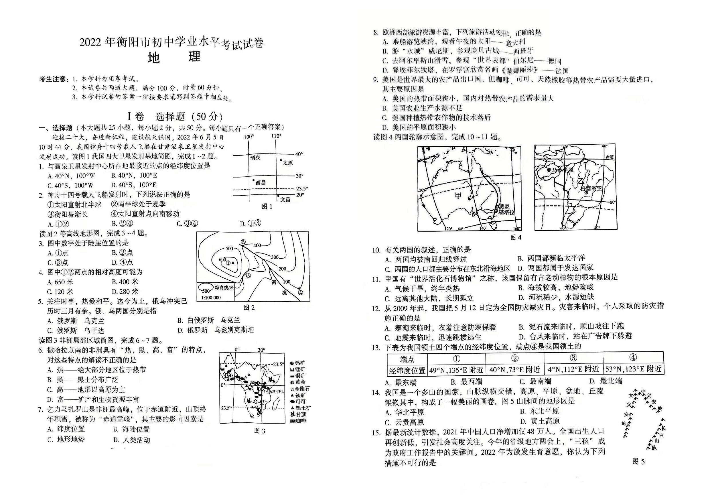 2022年湖南省衡阳市中考地理真题
