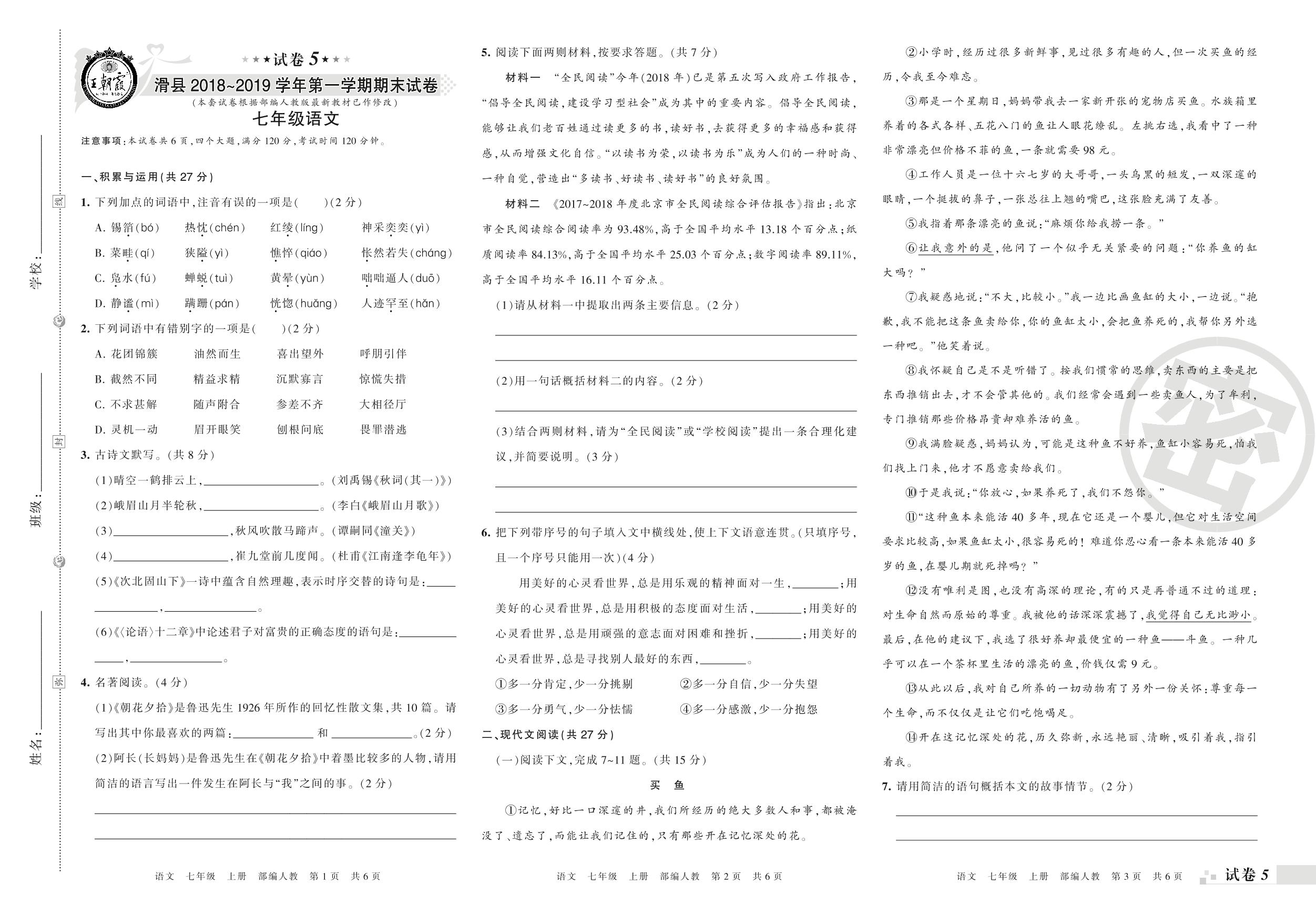 2018-2019学年第一学期安阳市滑县七年级语文试卷(人教版)【5】