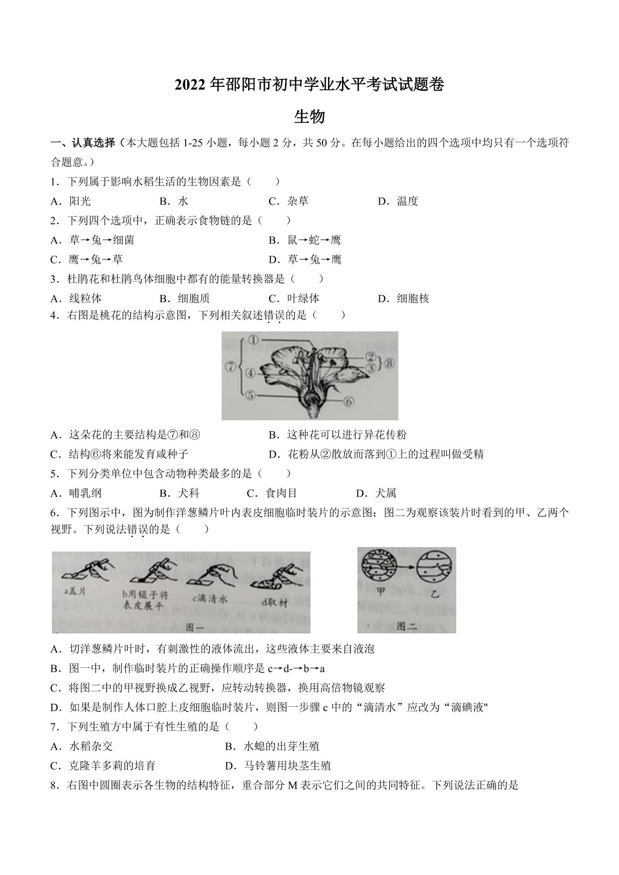 2022年湖南省邵阳市中考生物真题