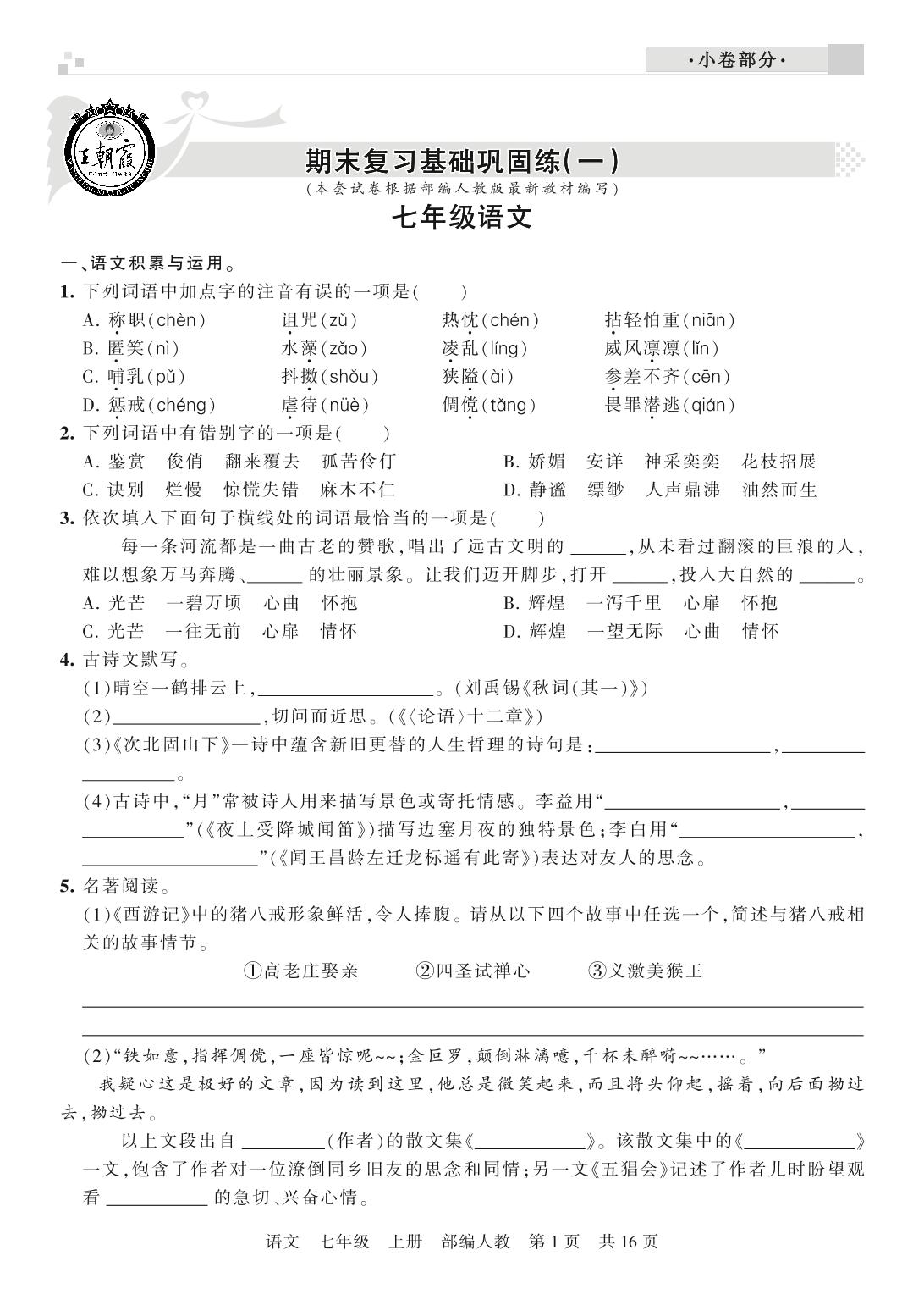 王朝霞期末小卷——期末复习基础巩固练七年级上册语文(人教版)_R21080231401【0】