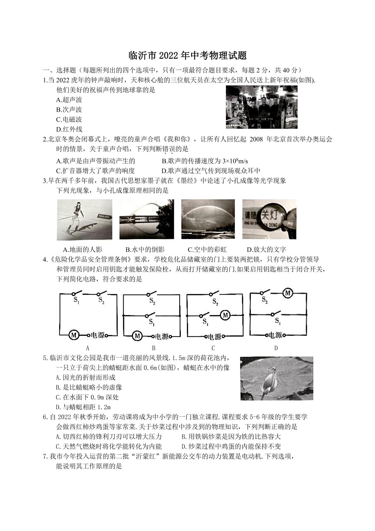 2022年山东省临沂市中考物理真题(无答案)
