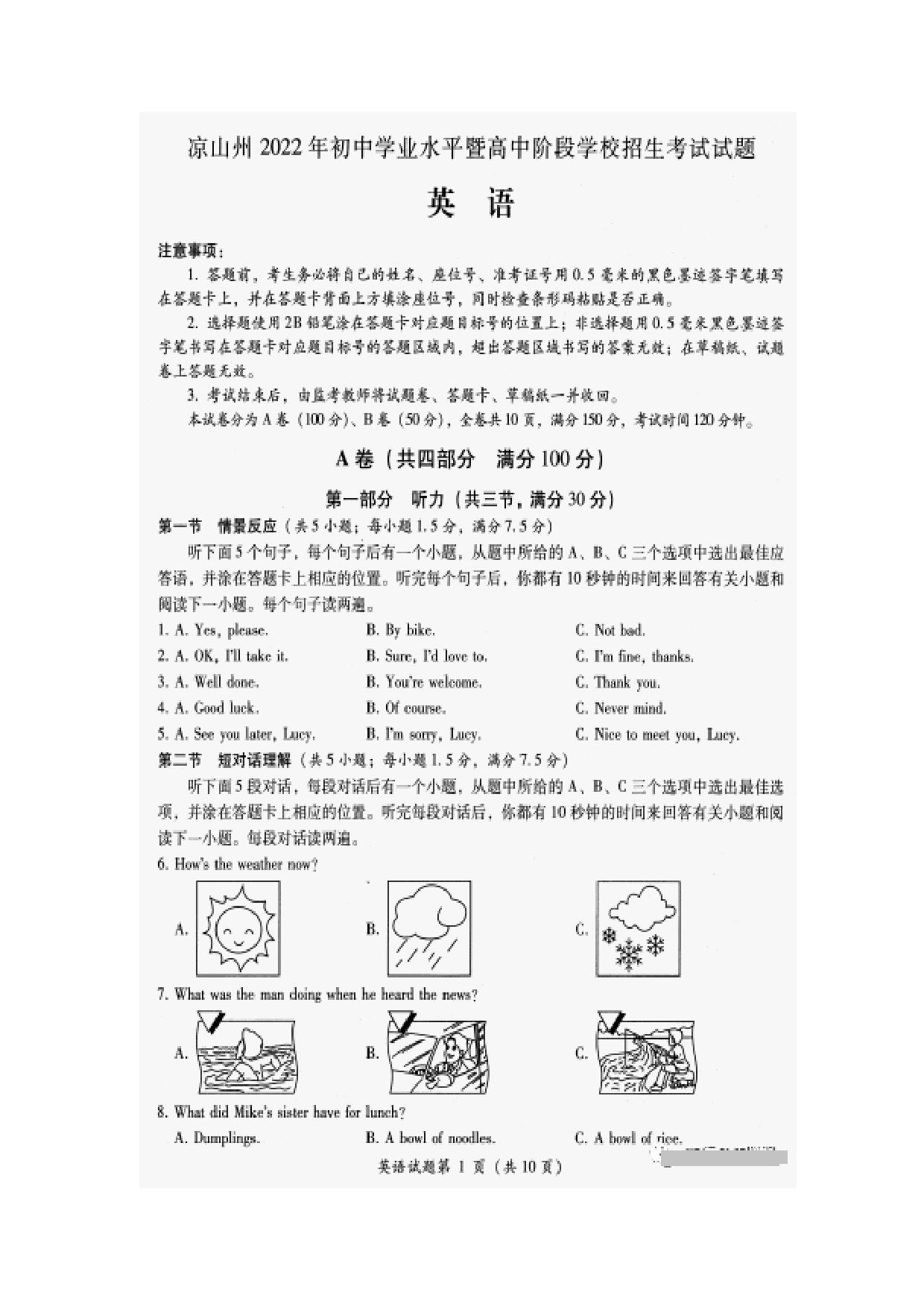 2022年四川省凉山州中考英语真题(无答案)【无听力音频】