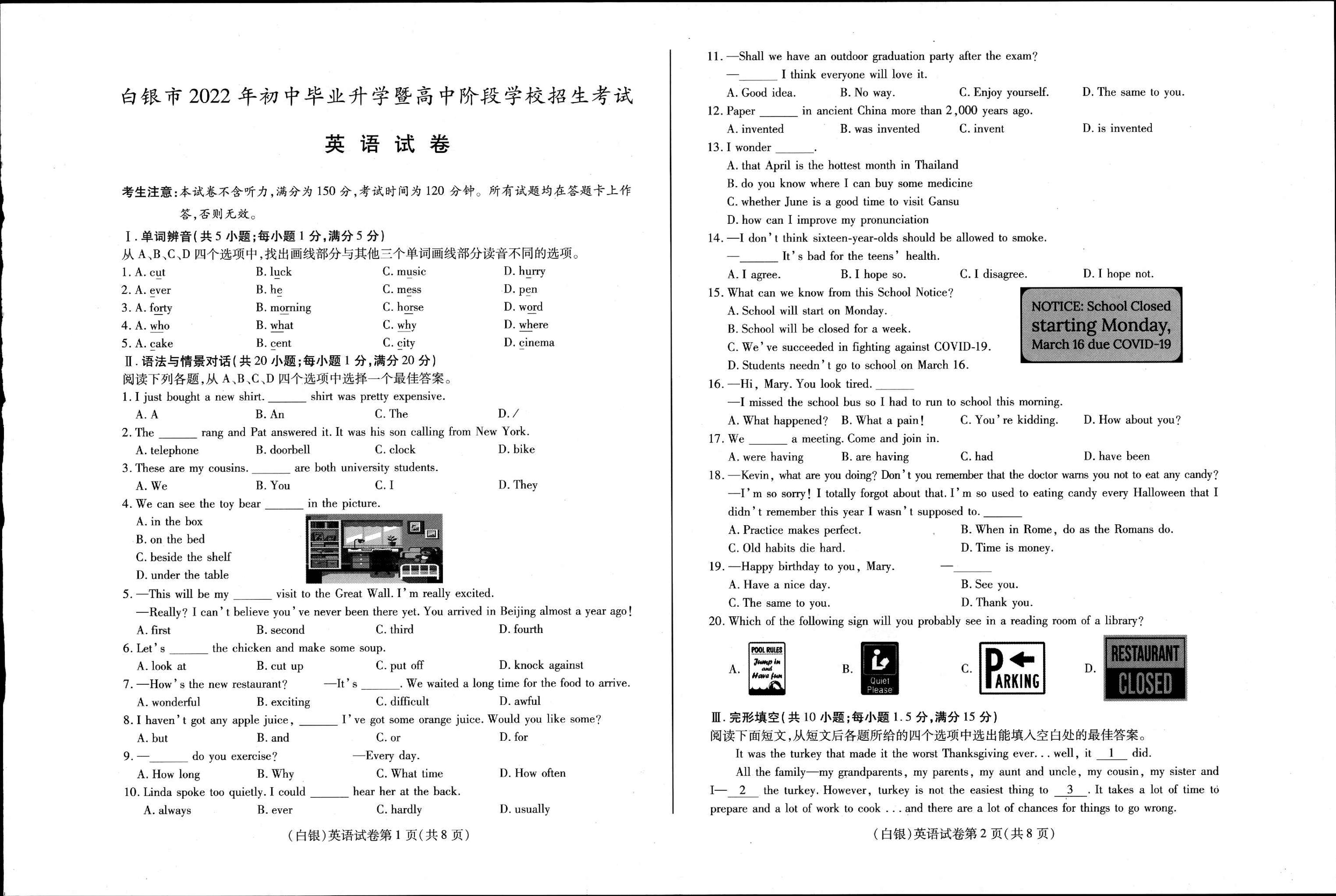 2022年甘肃省白银市中考英语真题【无听力音频】