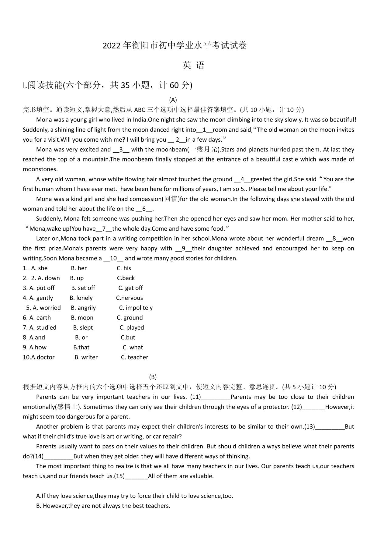 2022年湖南省衡阳市中考英语真题【无听力音频】