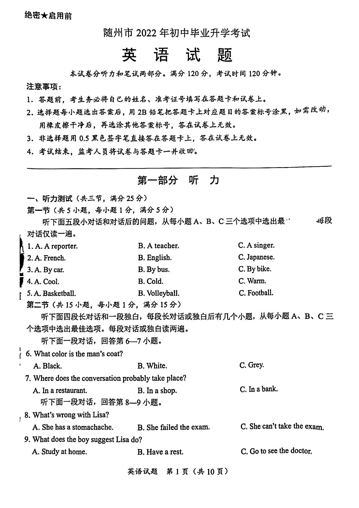 2022年湖北省随州市中考英语真题(无答案)【无听力音频】