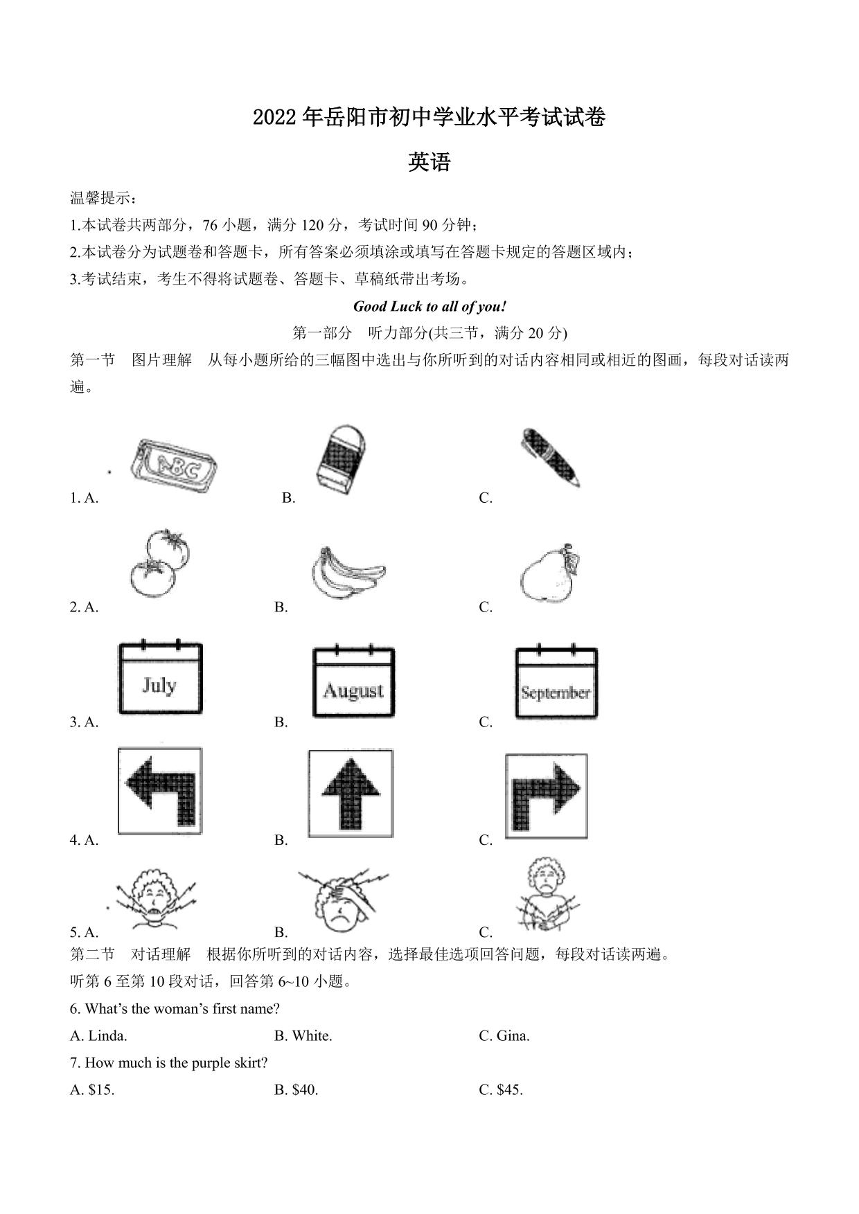 2022年湖南省岳阳市中考英语真题(无答案)【无听力音频】