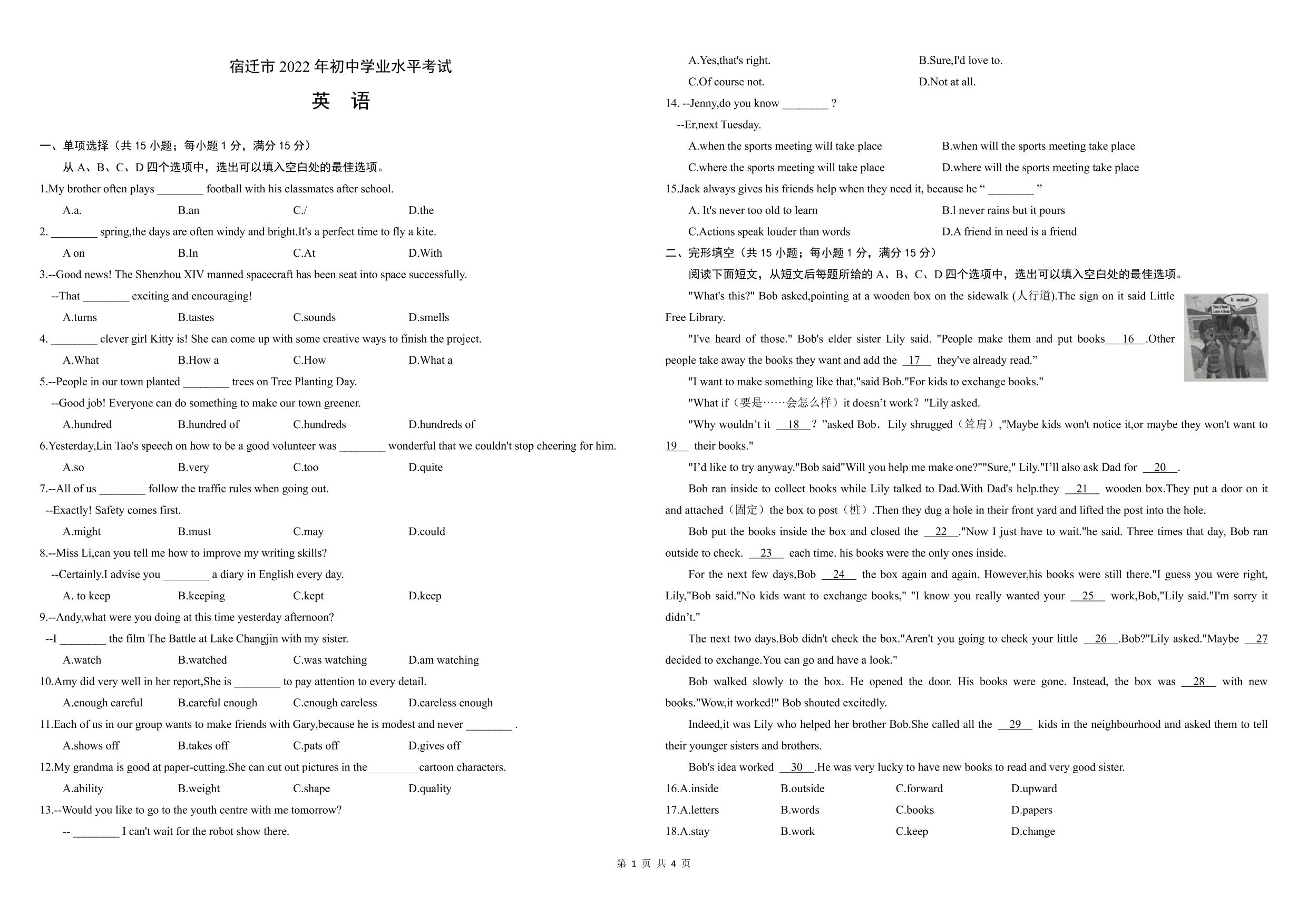 2022年江苏省宿迁市中考英语真题【无听力音频】