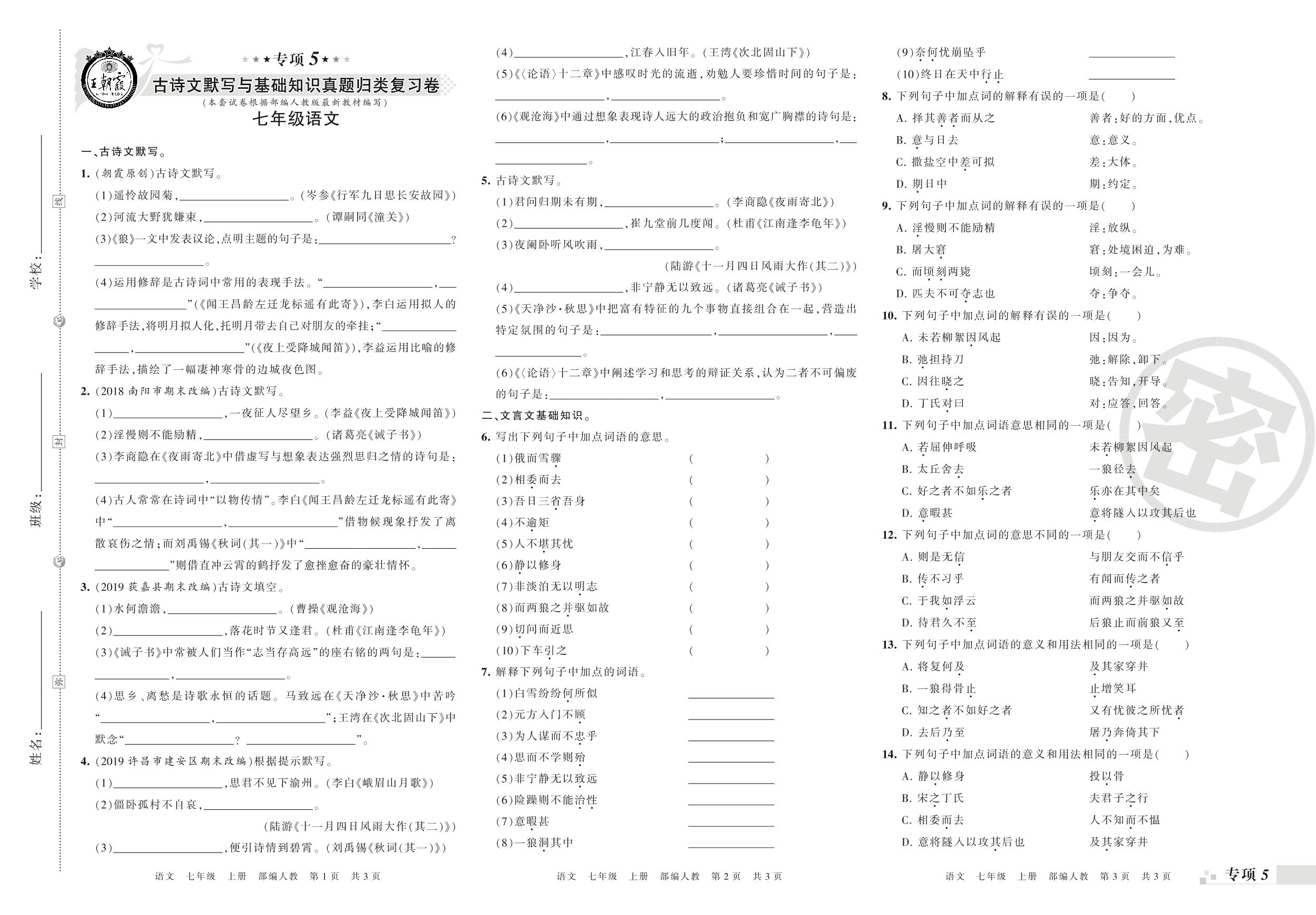 王朝霞期末专项卷——古诗文默写与基础知识、课内文言文阅读真题归类复习七年级上册语文(人教版)_R21080231427【0】