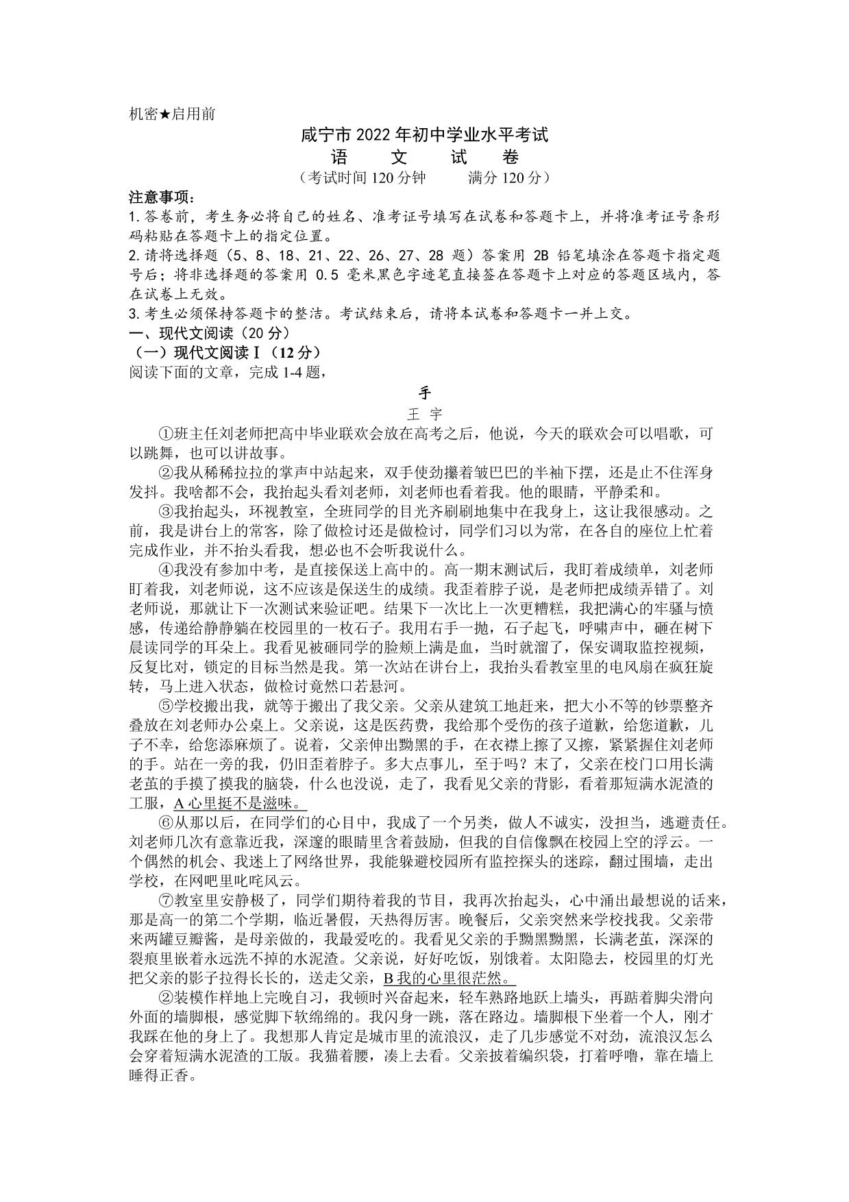 2022年湖北省咸宁市中考语文真题(无答案)