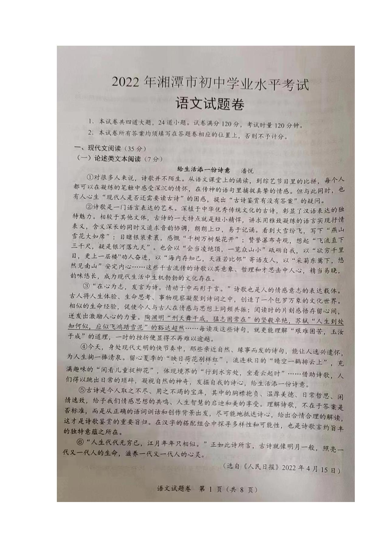 2022年湖南省湘潭市中考语文真题(无答案)