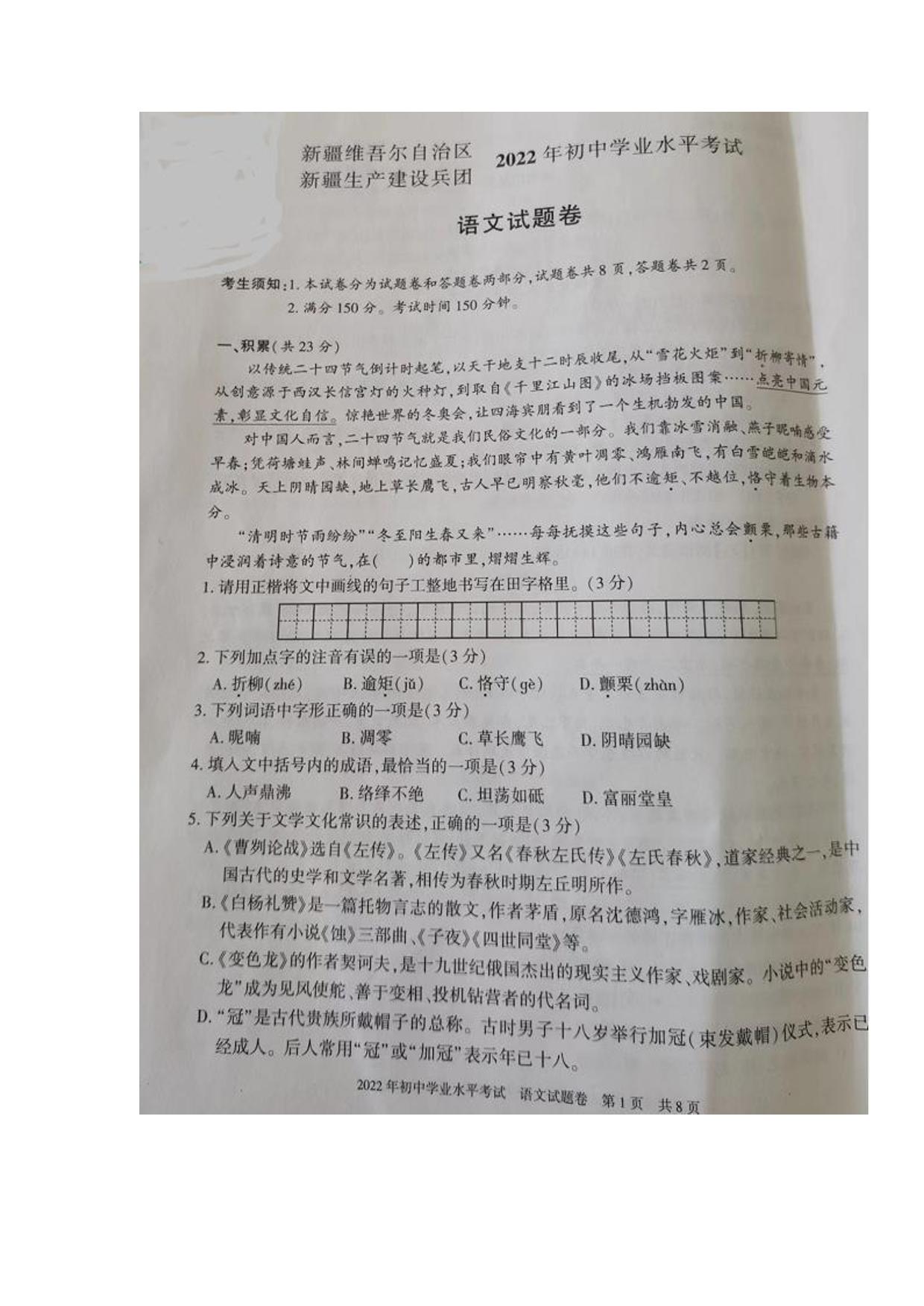 2022年新疆维吾尔自治区新疆生产建设兵团中考语文真题(无答案)