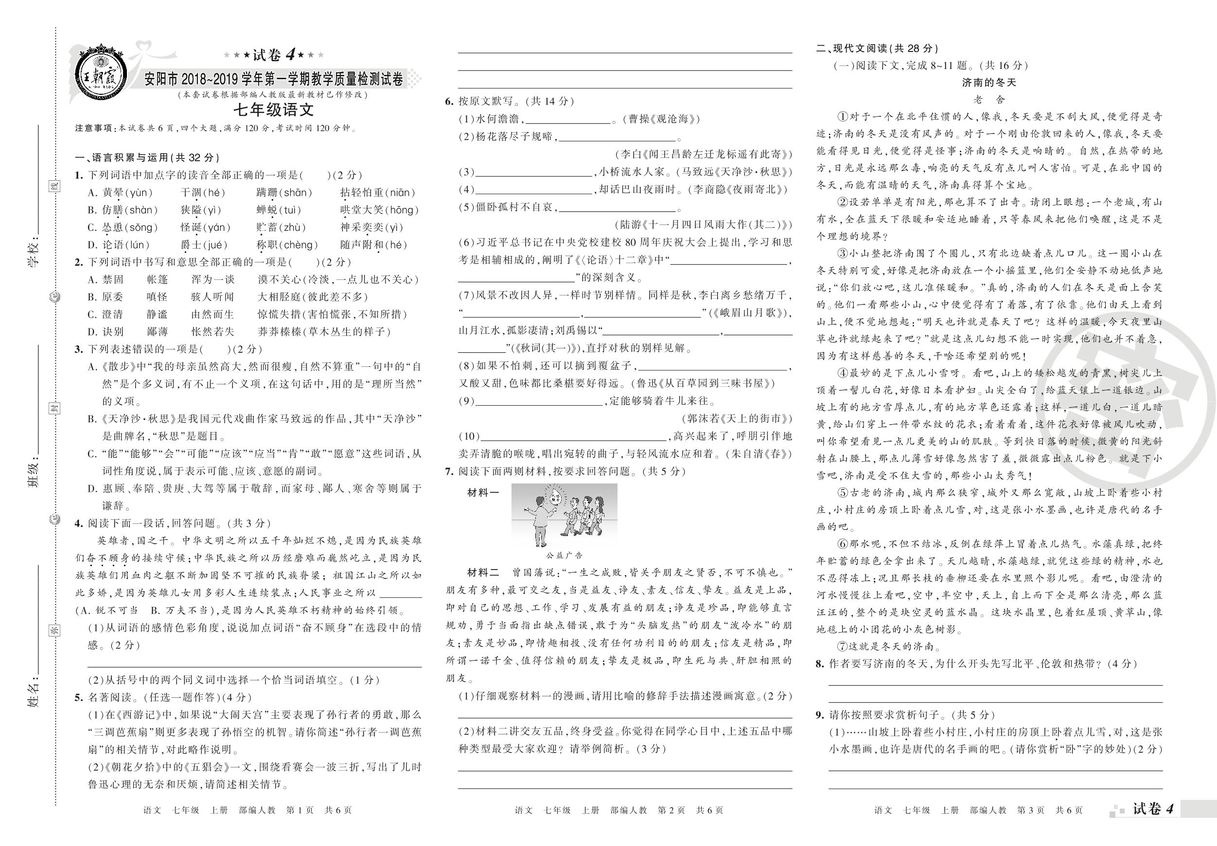 2018-2019学年第一学期安阳市七年级语文试卷(人教版)【4】