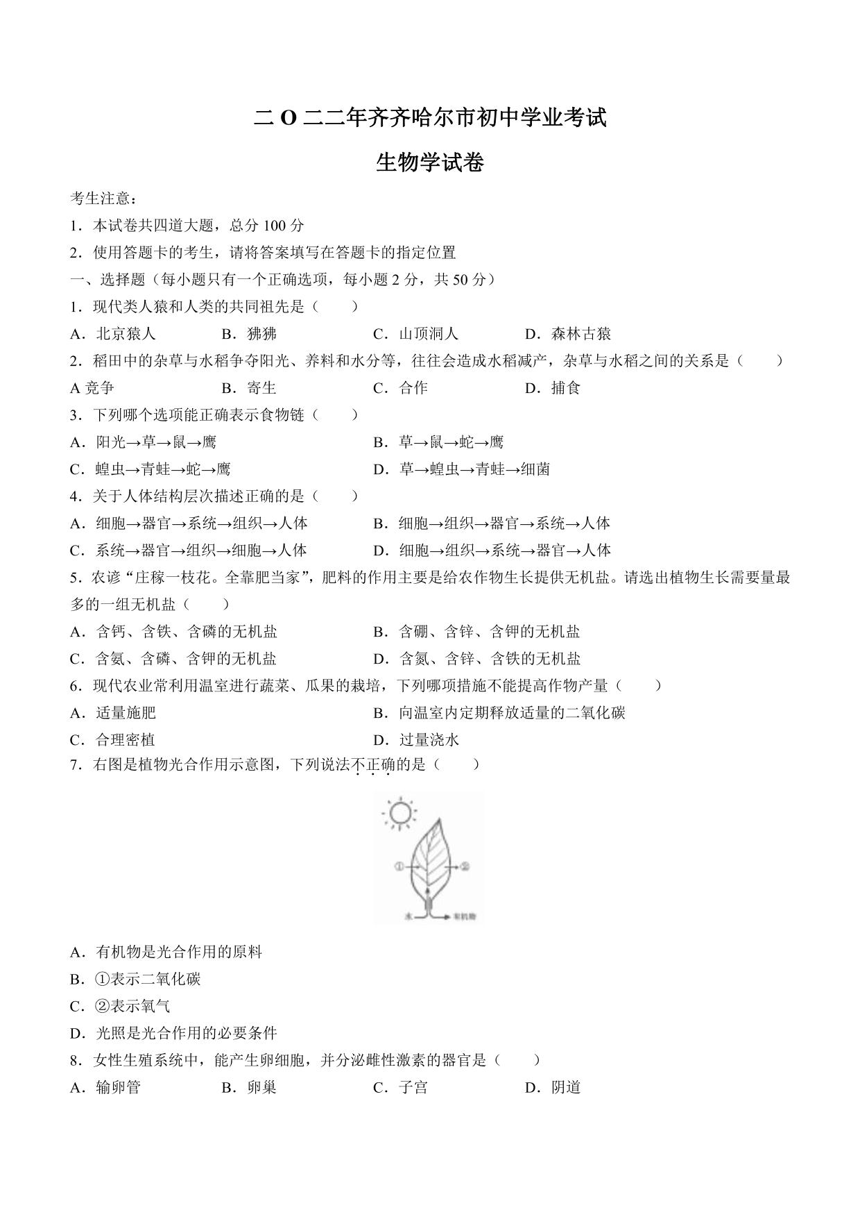 2022年黑龙江省齐齐哈尔市中考生物真题