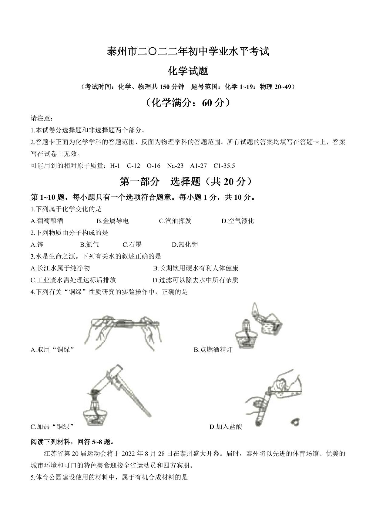 2022年江苏省泰州市中考化学真题