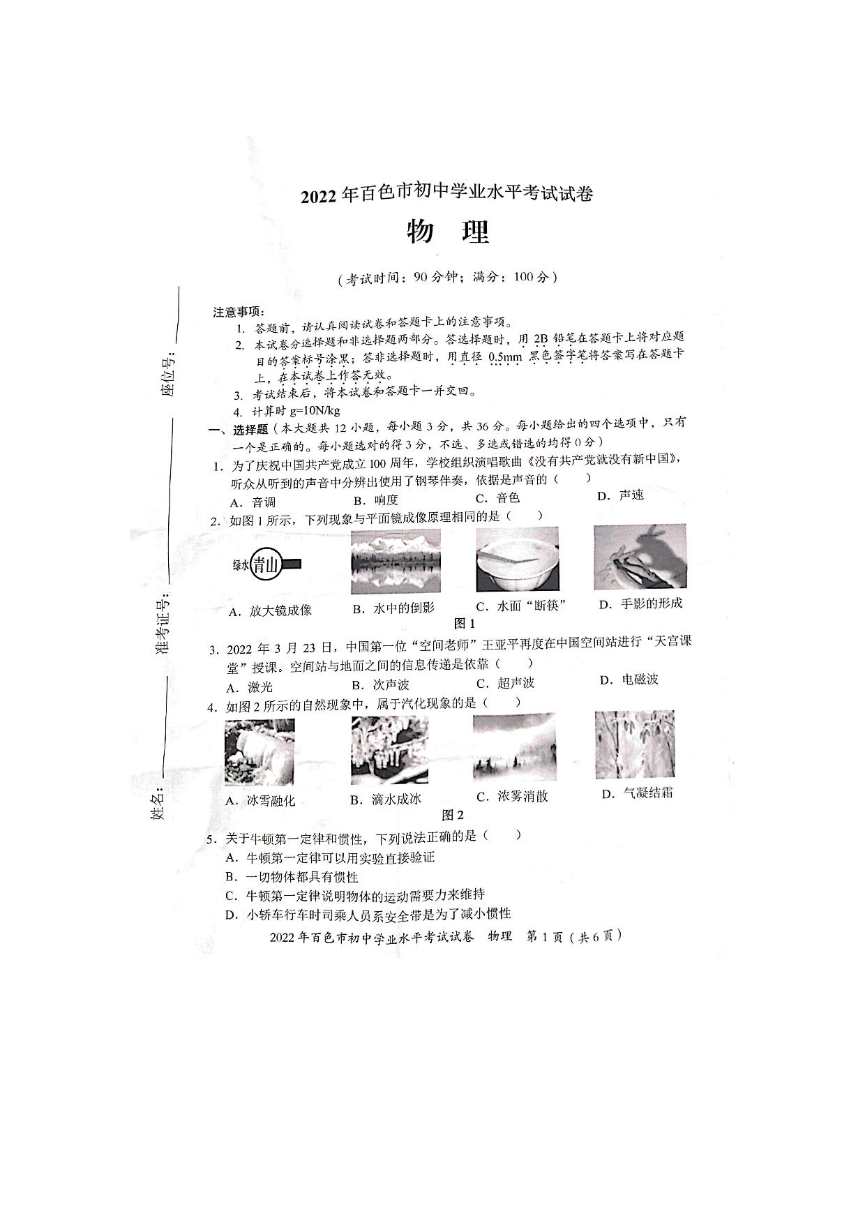 2022年广西省百色市中考物理真题