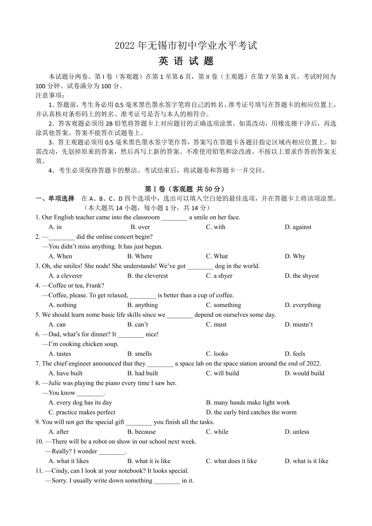 2022年江苏省无锡市中考英语真题【无听力音频】