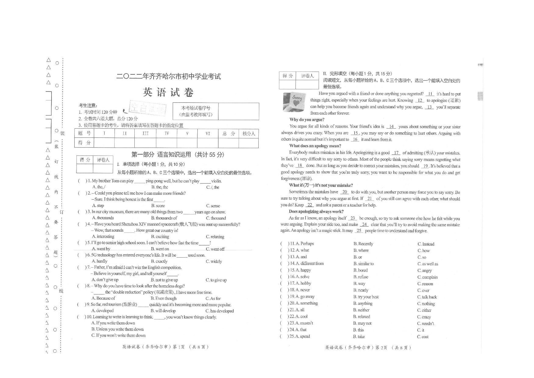 2022年黑龙江省齐齐哈尔市中考英语真题【无听力音频】