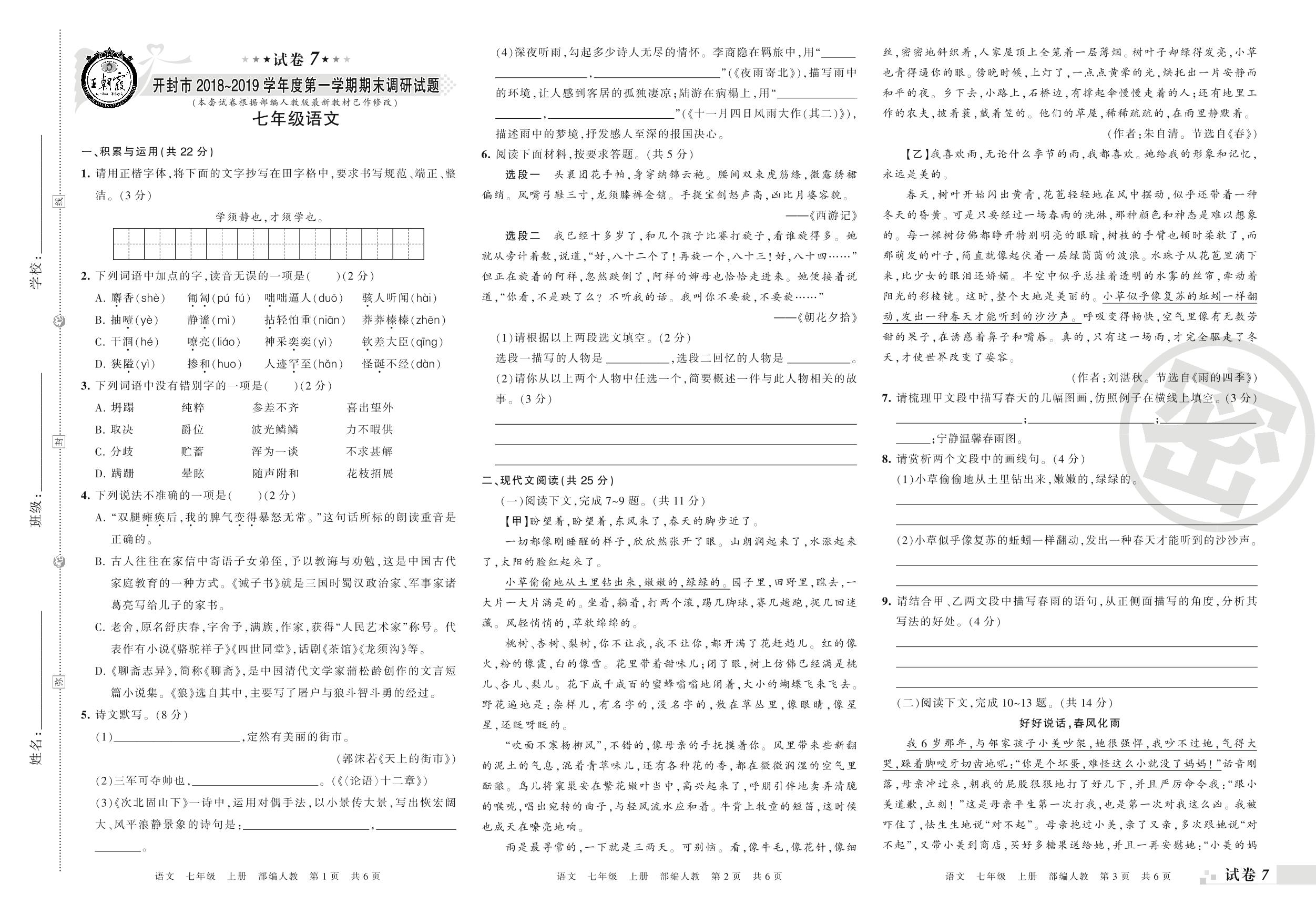 2018-2019学年第一学期开封市七年级语文试卷(人教版)【7】
