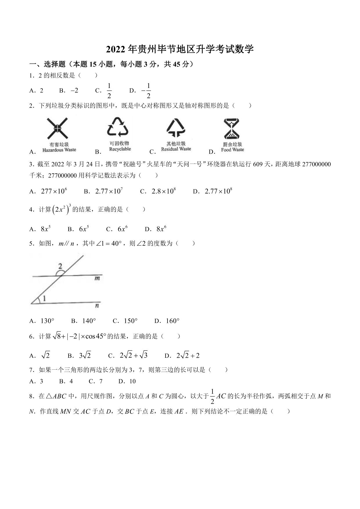 2022年贵州省毕节市中考数学真题