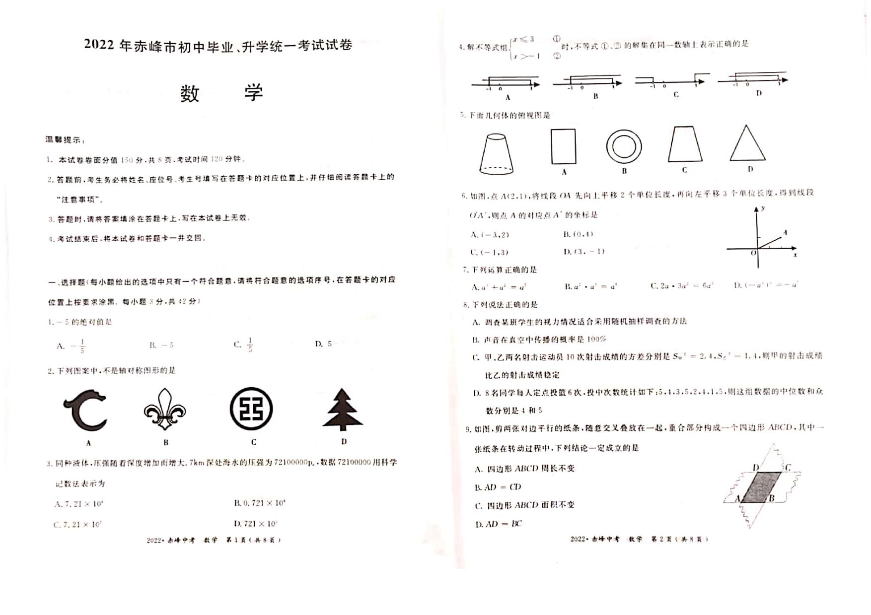2022年内蒙古赤峰市中考数学真题