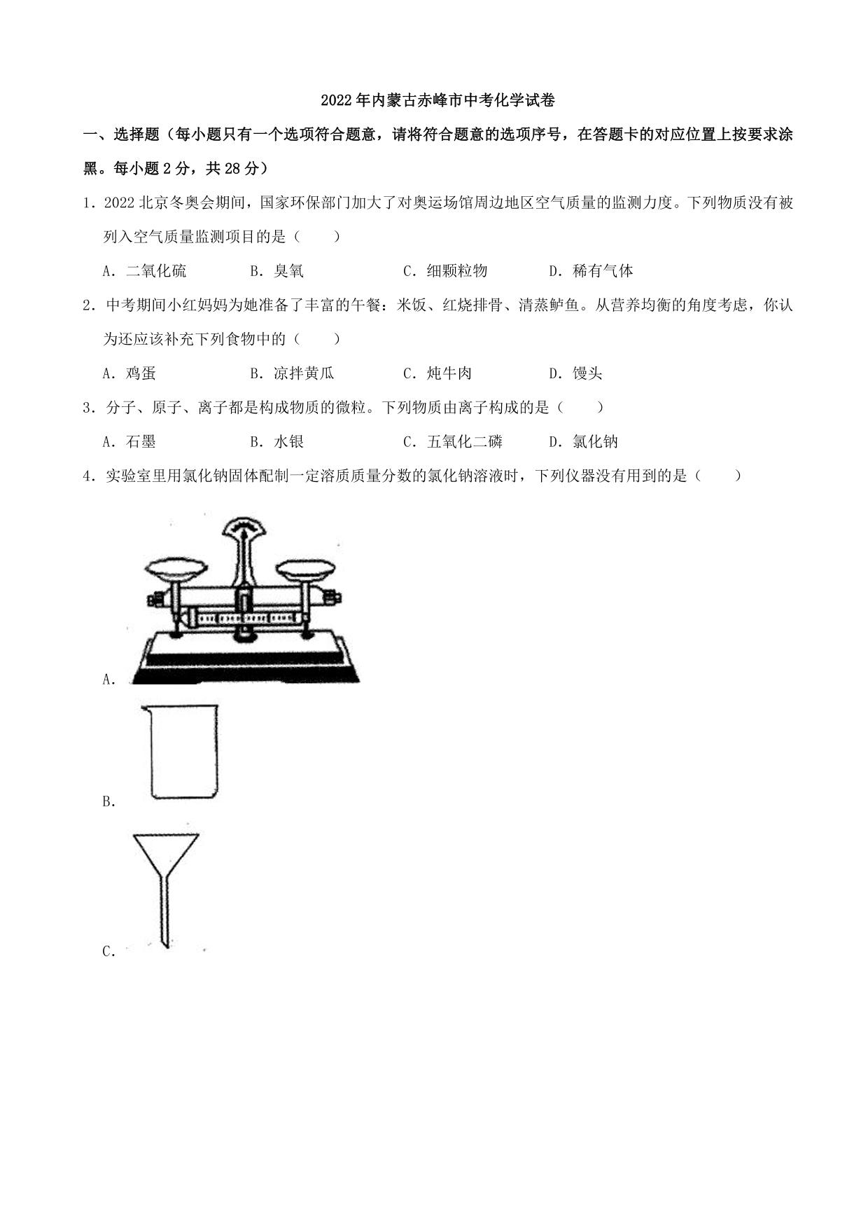 2022年内蒙古赤峰市中考化学真题