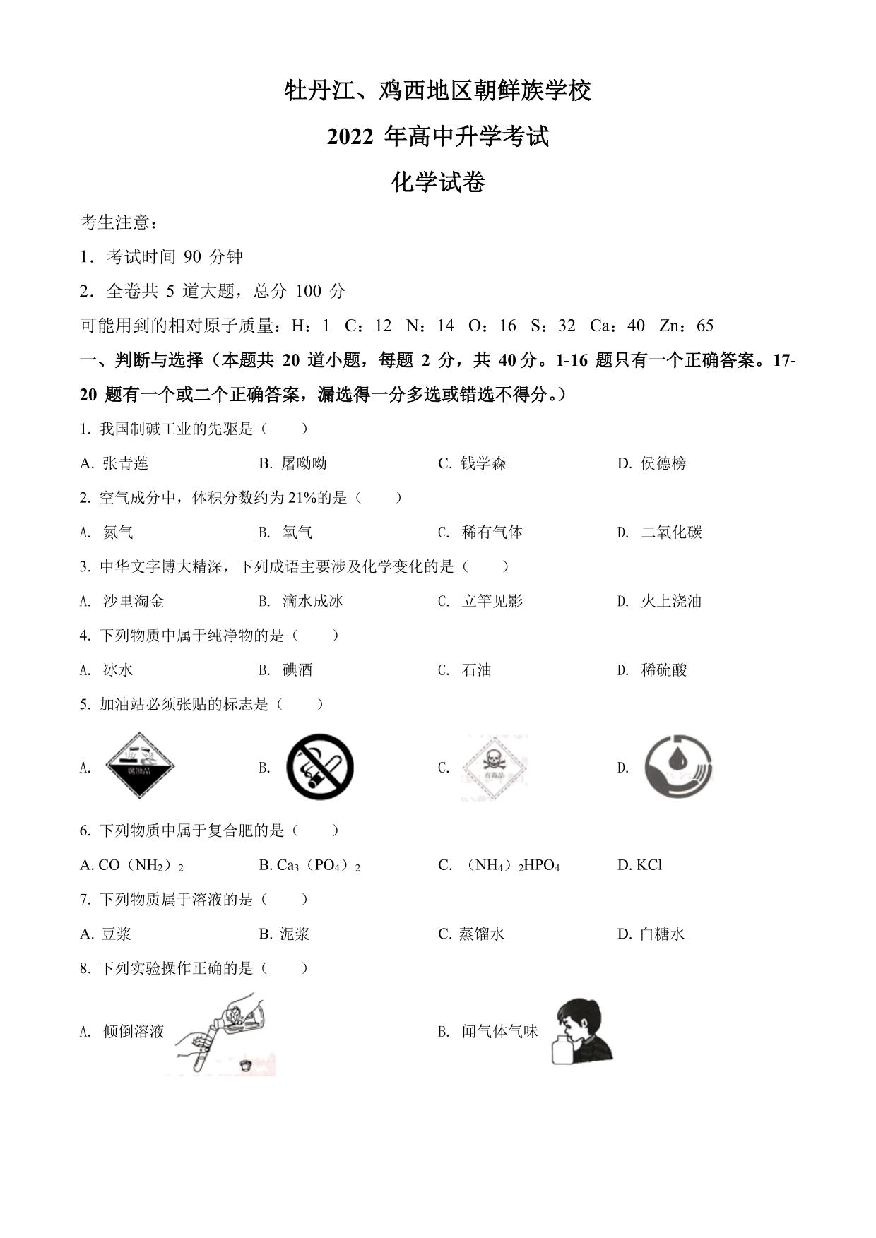 2022年黑龙江省牡丹江、鸡西地区朝鲜族学校中考化学真题
