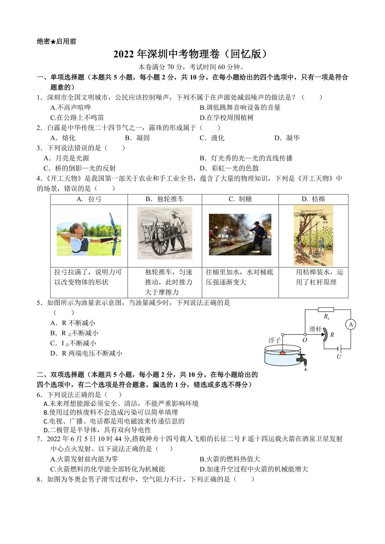 2022年深圳市中考物理真题