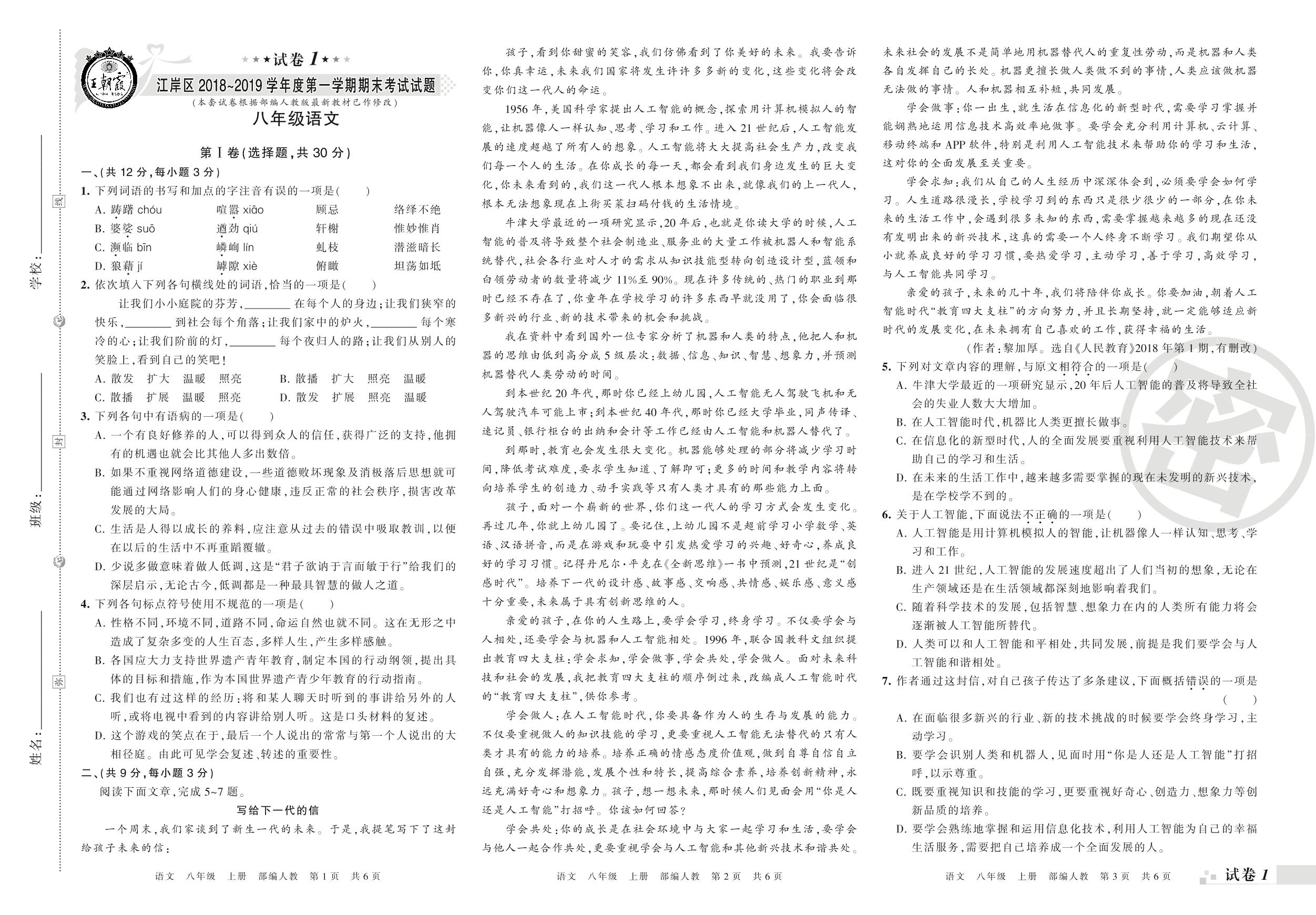 2018-2019学年第一学期武汉市江岸区八年级语文试卷(人教版)【1】