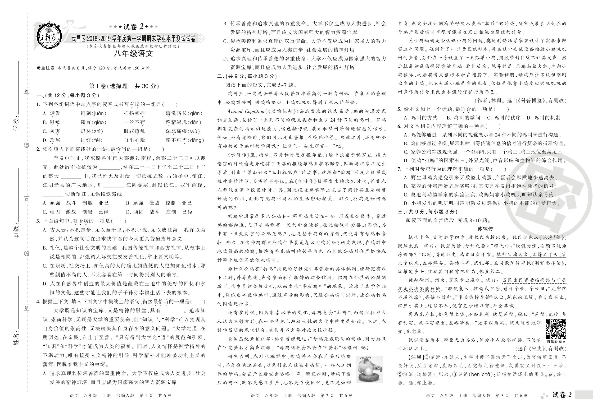 2018-2019学年第一学期武汉市武昌区八年级语文试卷(人教版)【2】