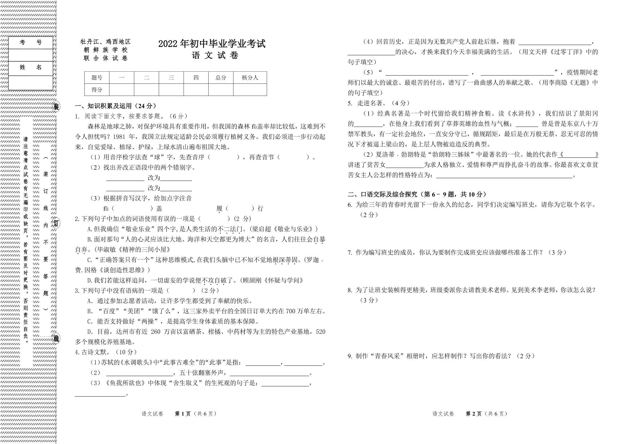 2022年黑龙江省牡丹江、鸡西地区朝鲜族学校中考语文真题