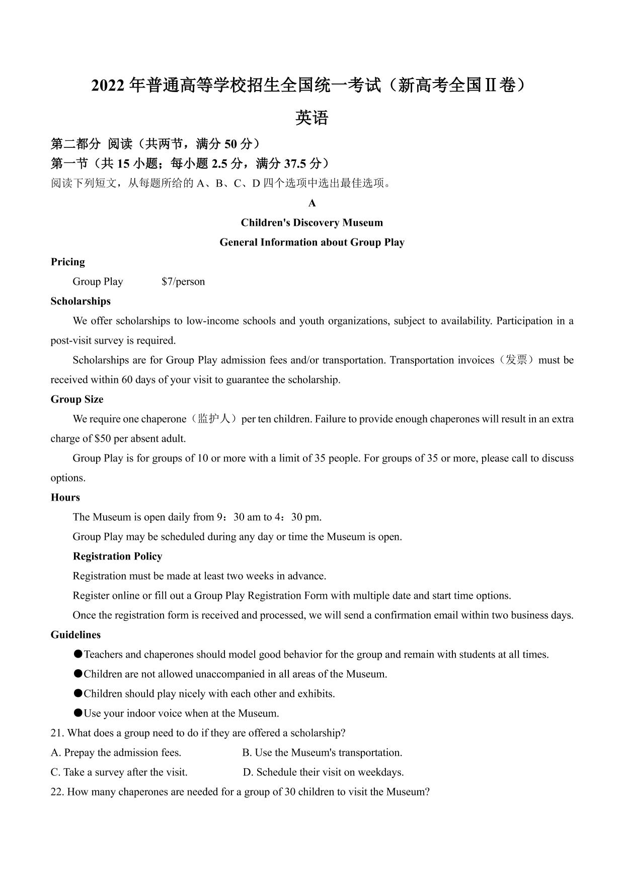 2022年新高考全国Ⅱ卷-英语【无听力音频】