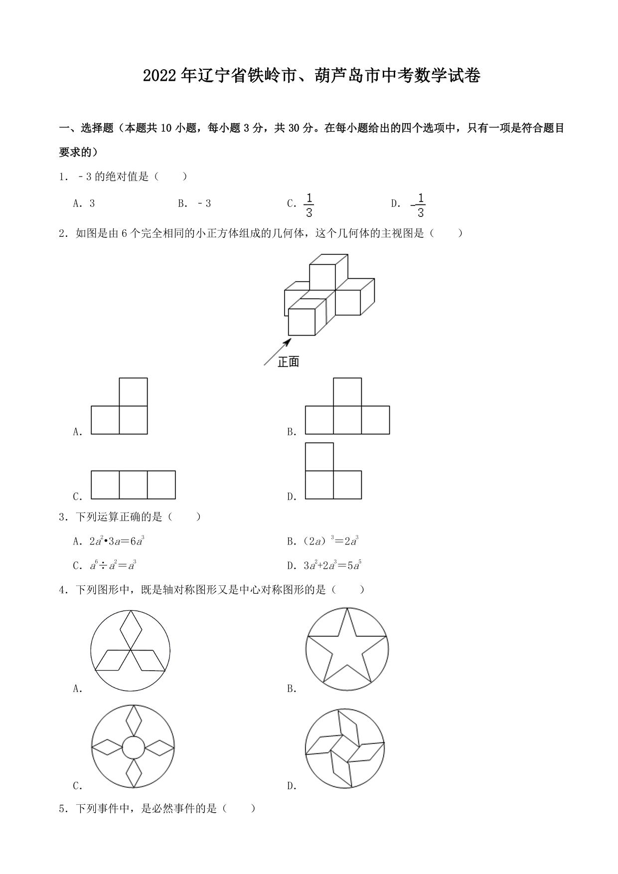 2022年辽宁省铁岭市、葫芦岛市中考数学真题