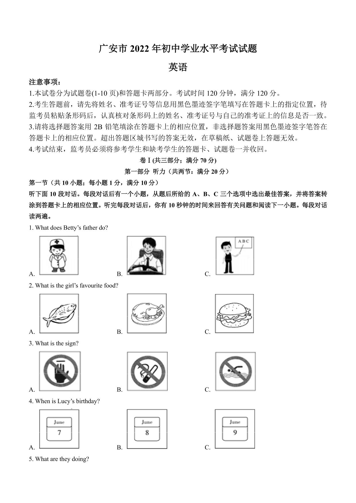 2022年四川省广安市中考英语真题【无听力音频】