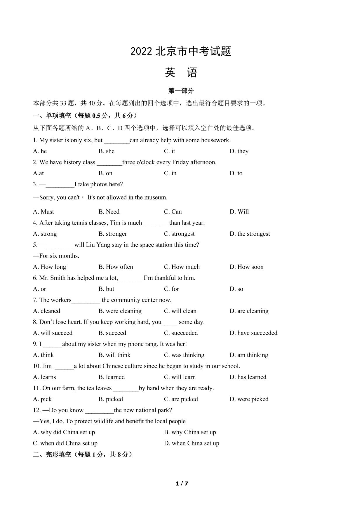 2022年北京市中考英语真题(无答案)【无听力音频】