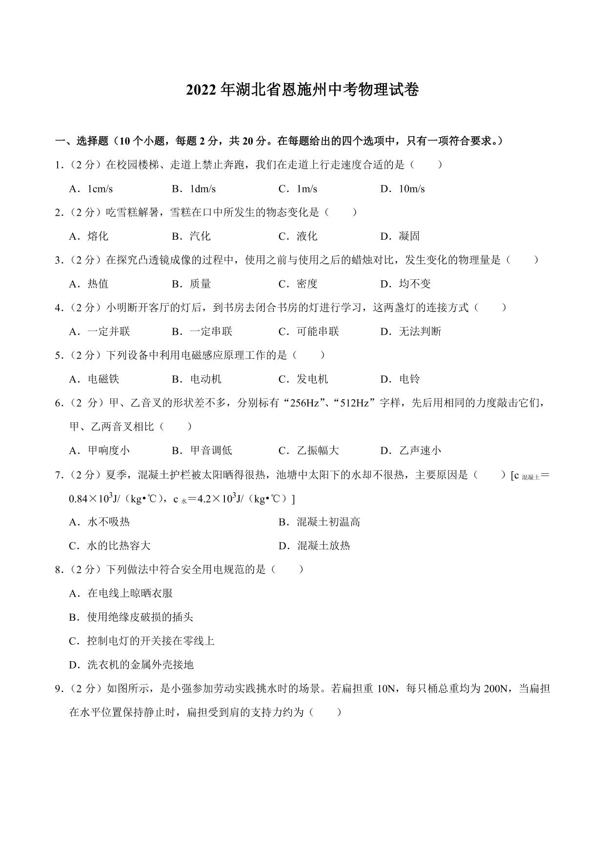 2022年湖北省恩施州中考物理真题