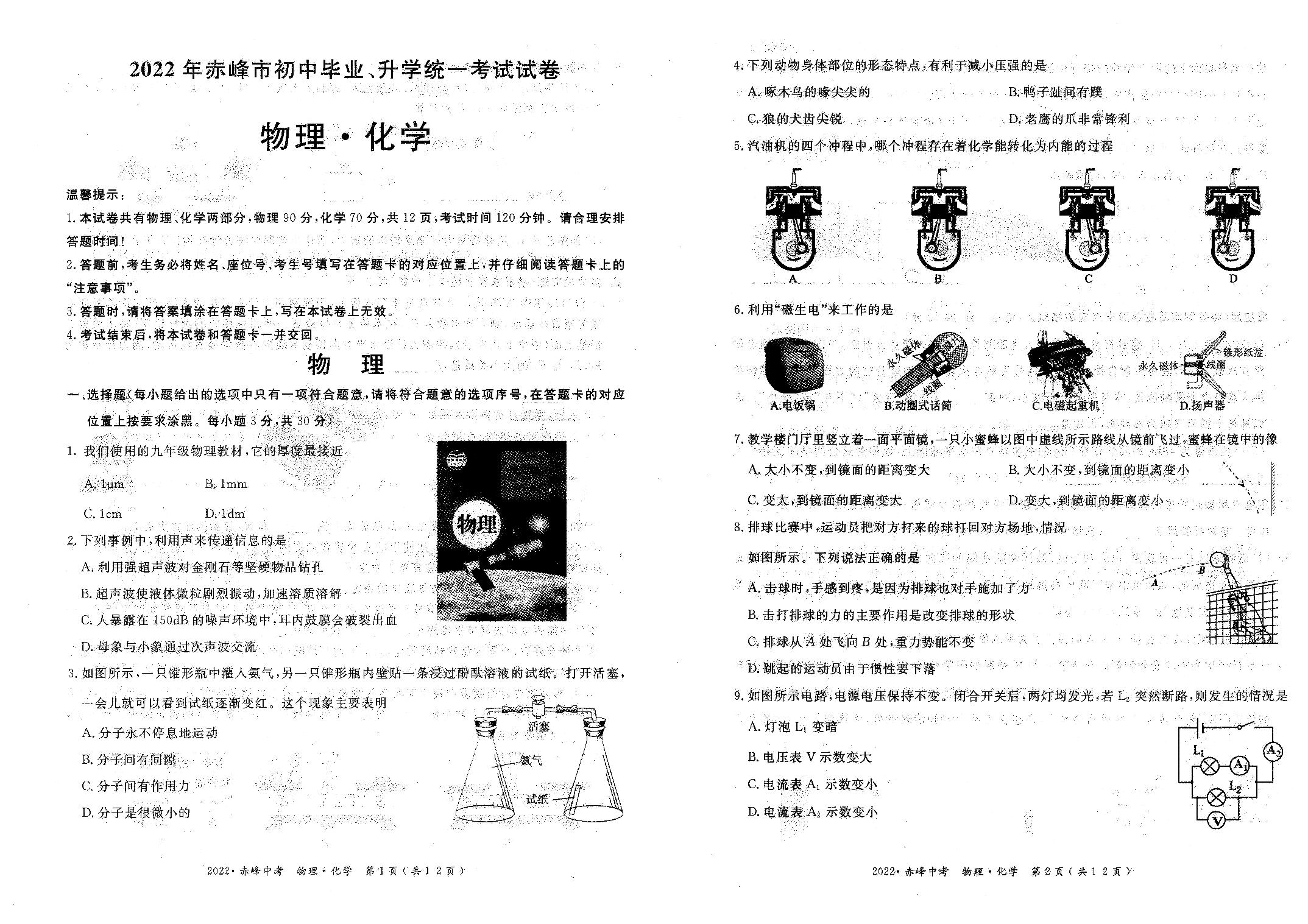 2022年内蒙古赤峰市中考物理真题(无答案)