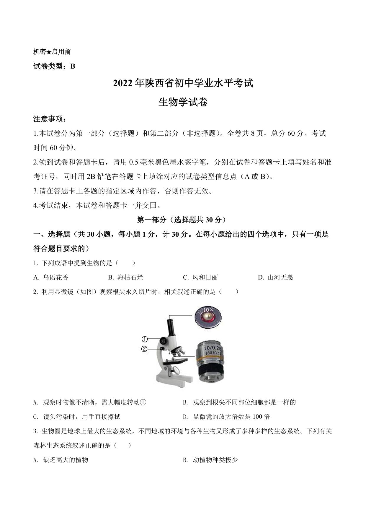 2022年陕西省中考生物真题(B卷)