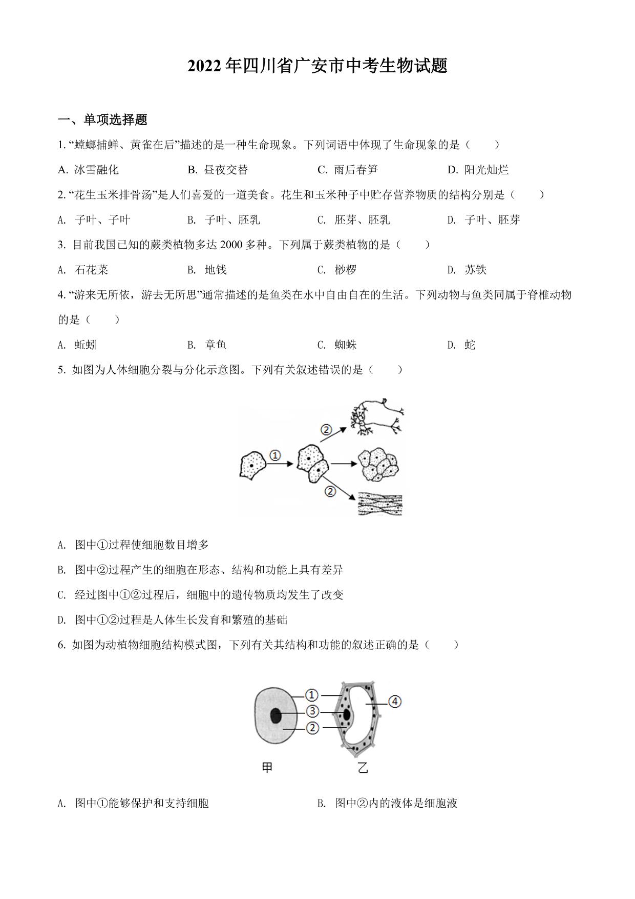 2022年四川省广安市中考生物真题