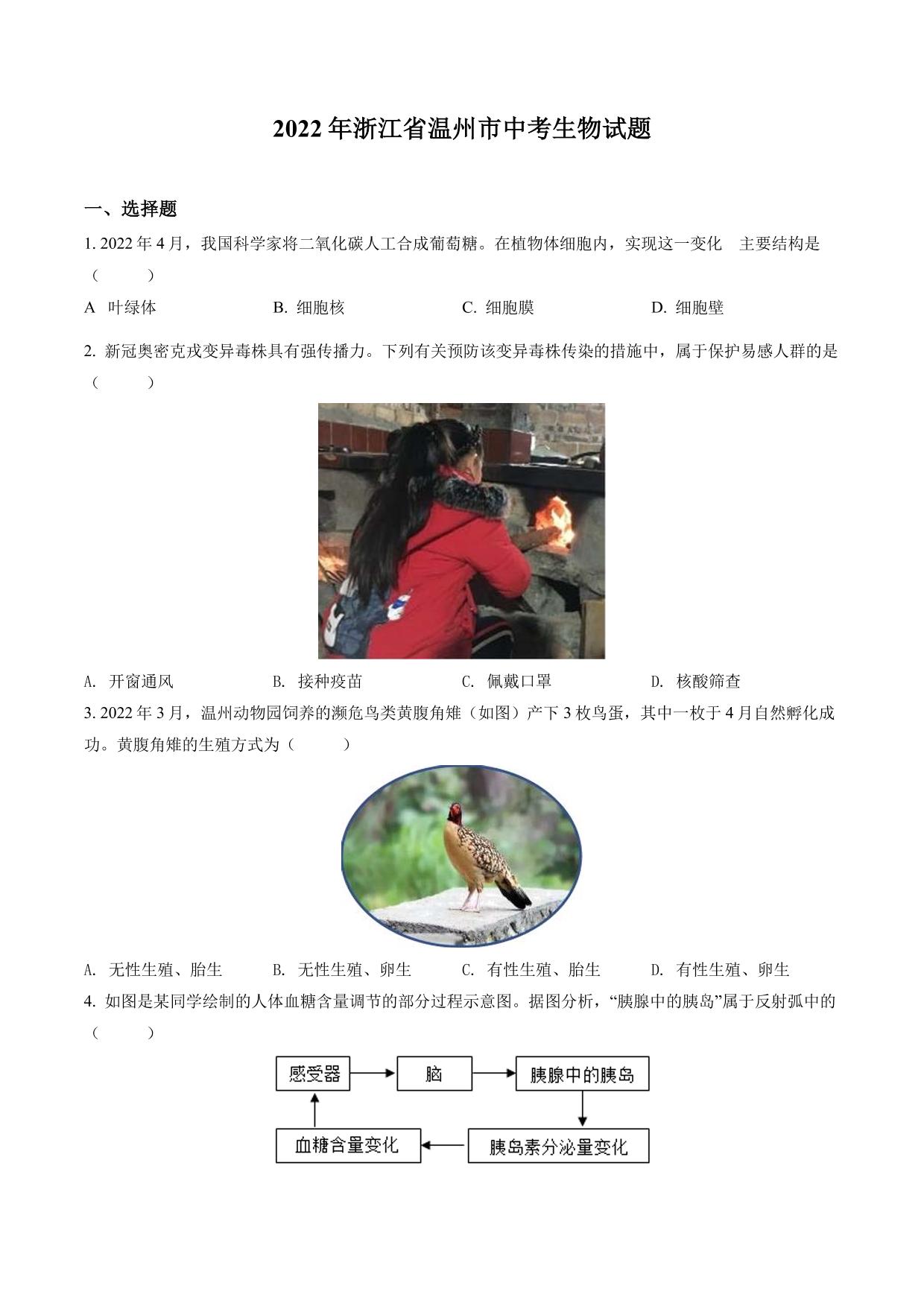 2022年浙江省温州市中考生物真题