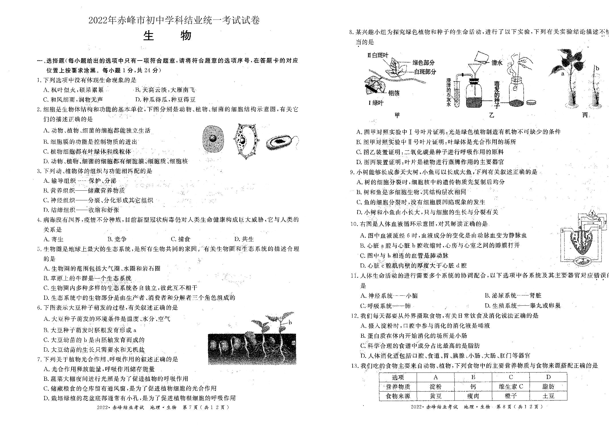 2022年内蒙古赤峰市中考生物真题(无答案)