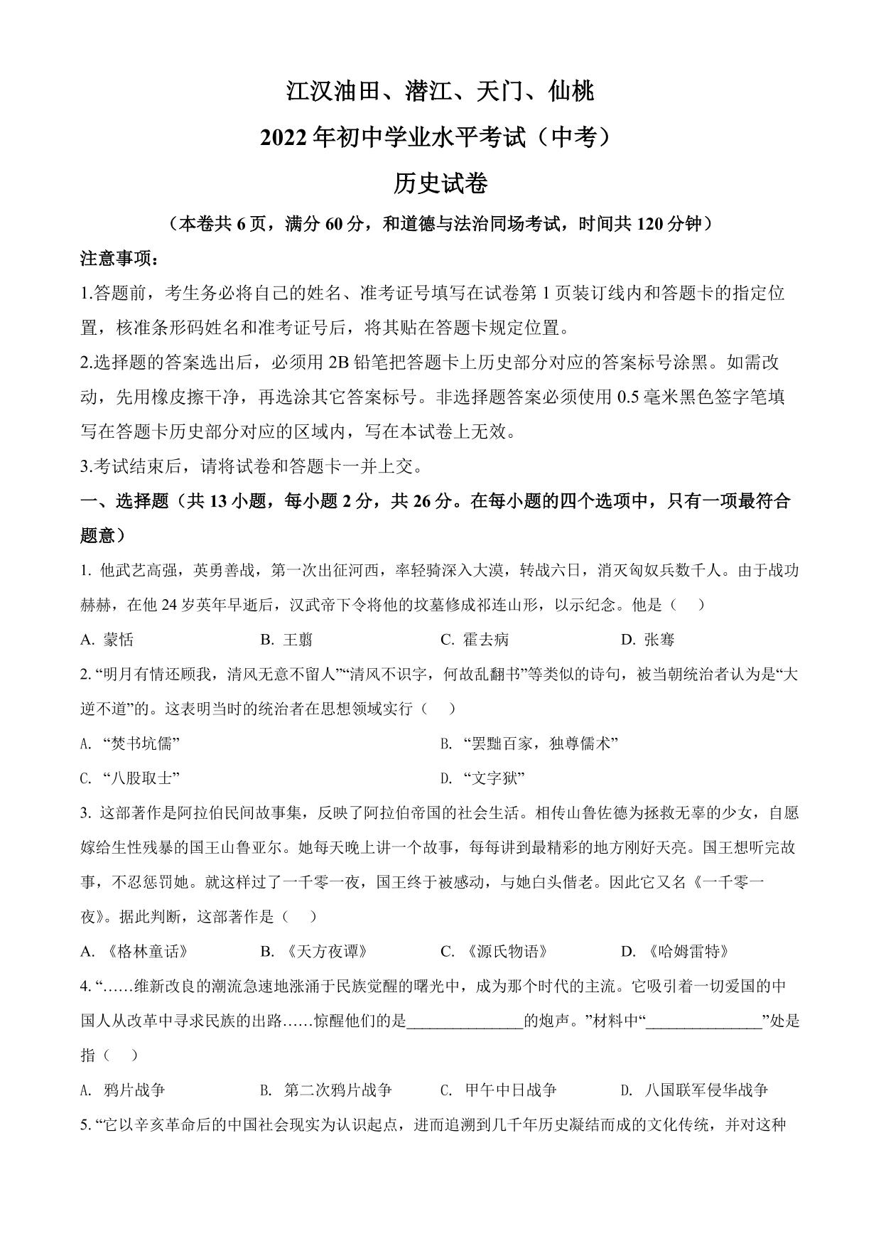 2022年湖北省江汉油田、潜江、天门、仙桃市中考历史真题