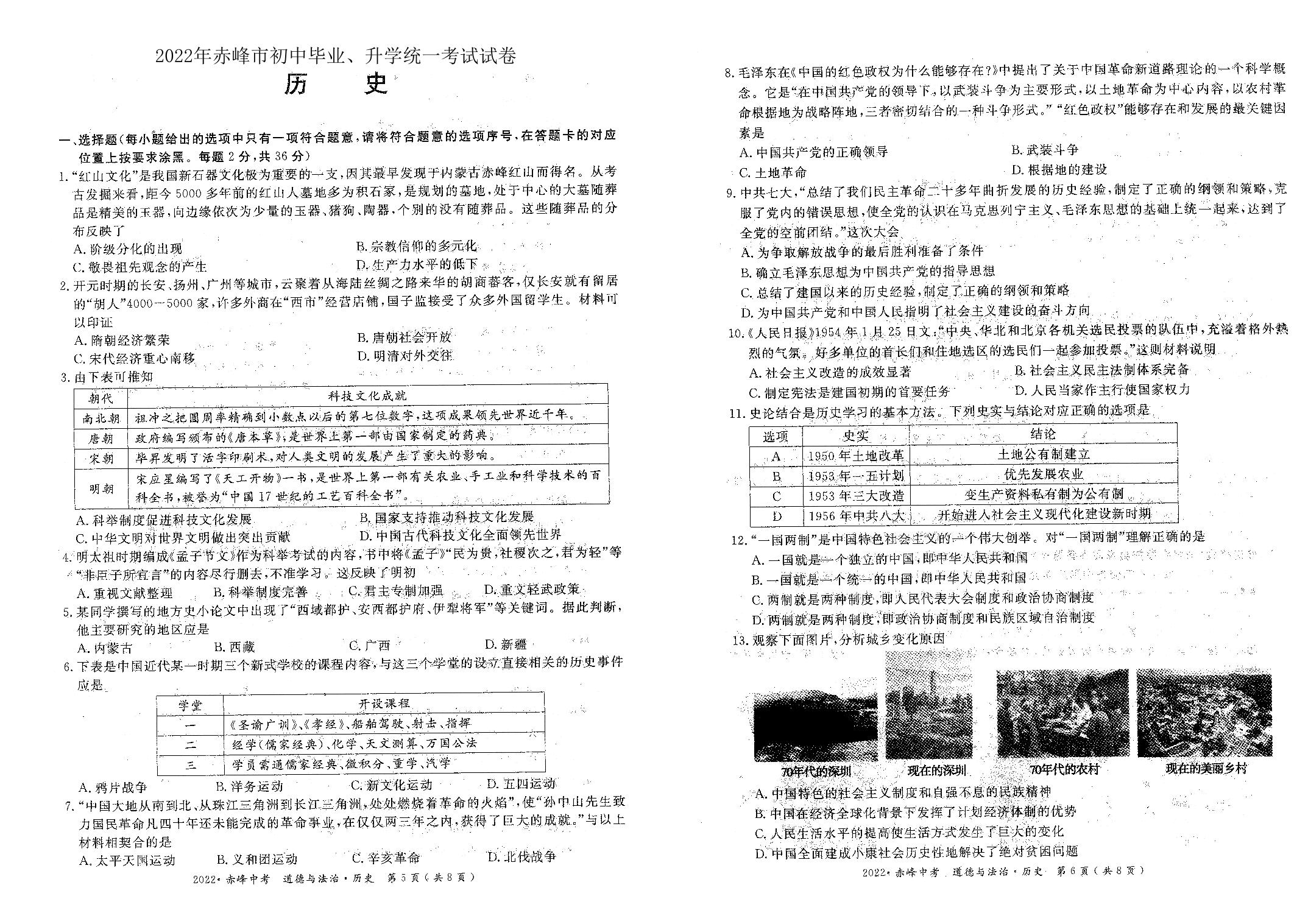 2022年内蒙古赤峰市中考历史真题(无答案)