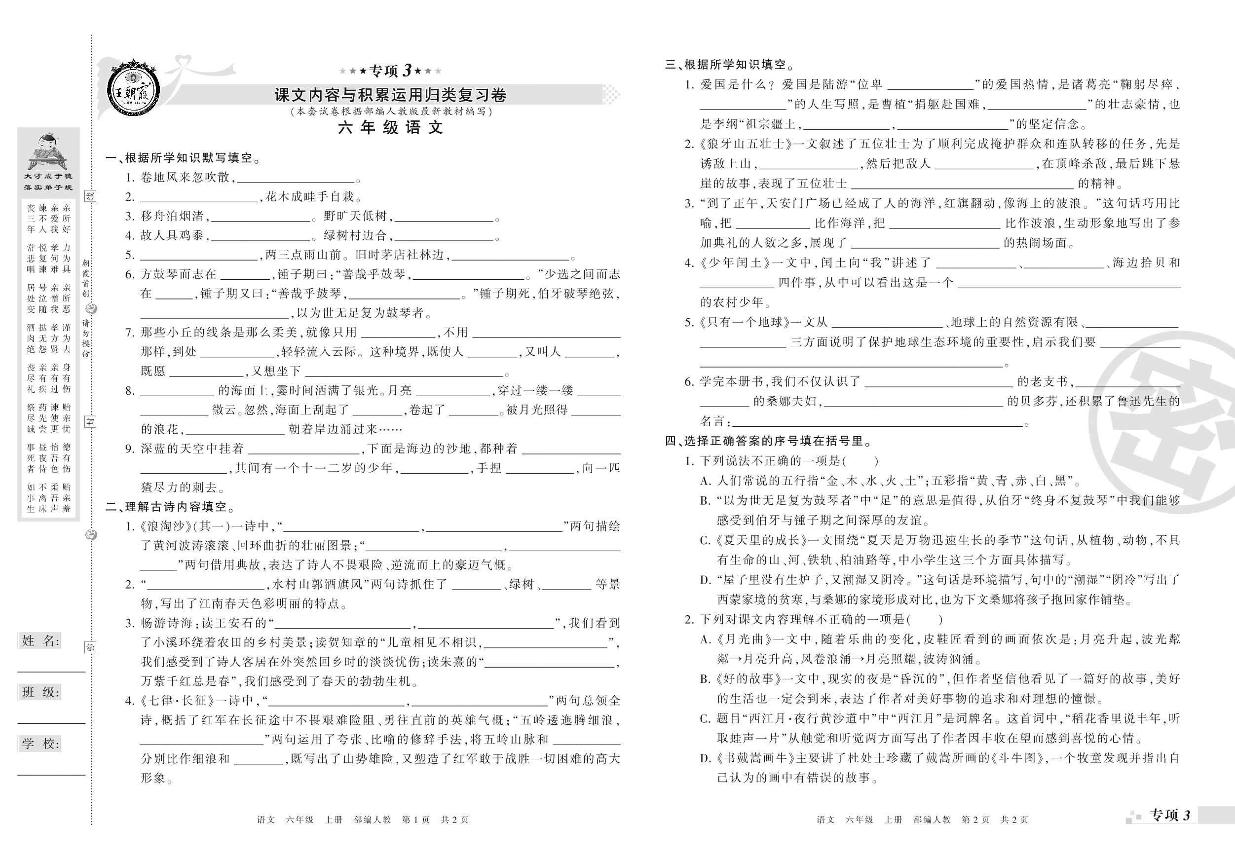 王朝霞期末专项卷——课文内容与积累运用、课内阅读与写作真题归类复习六年级上册语文(人教版)_R21080231744【0】