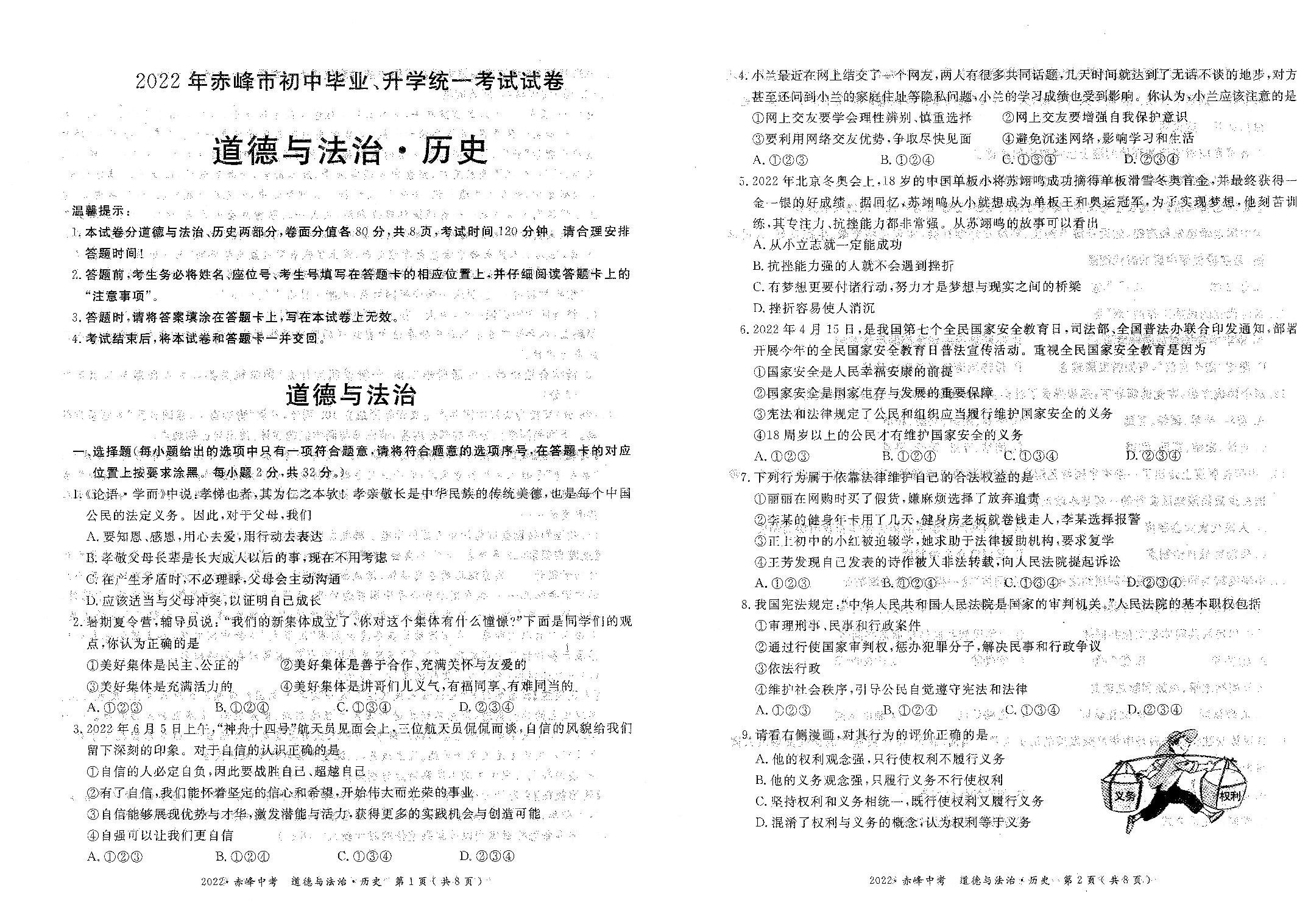 2022年内蒙古赤峰市中考道德与法治真题(无答案)