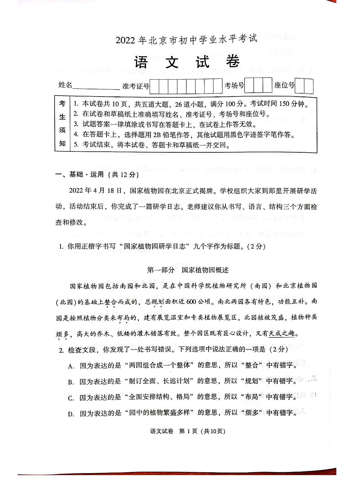 2022年北京市中考语文真题