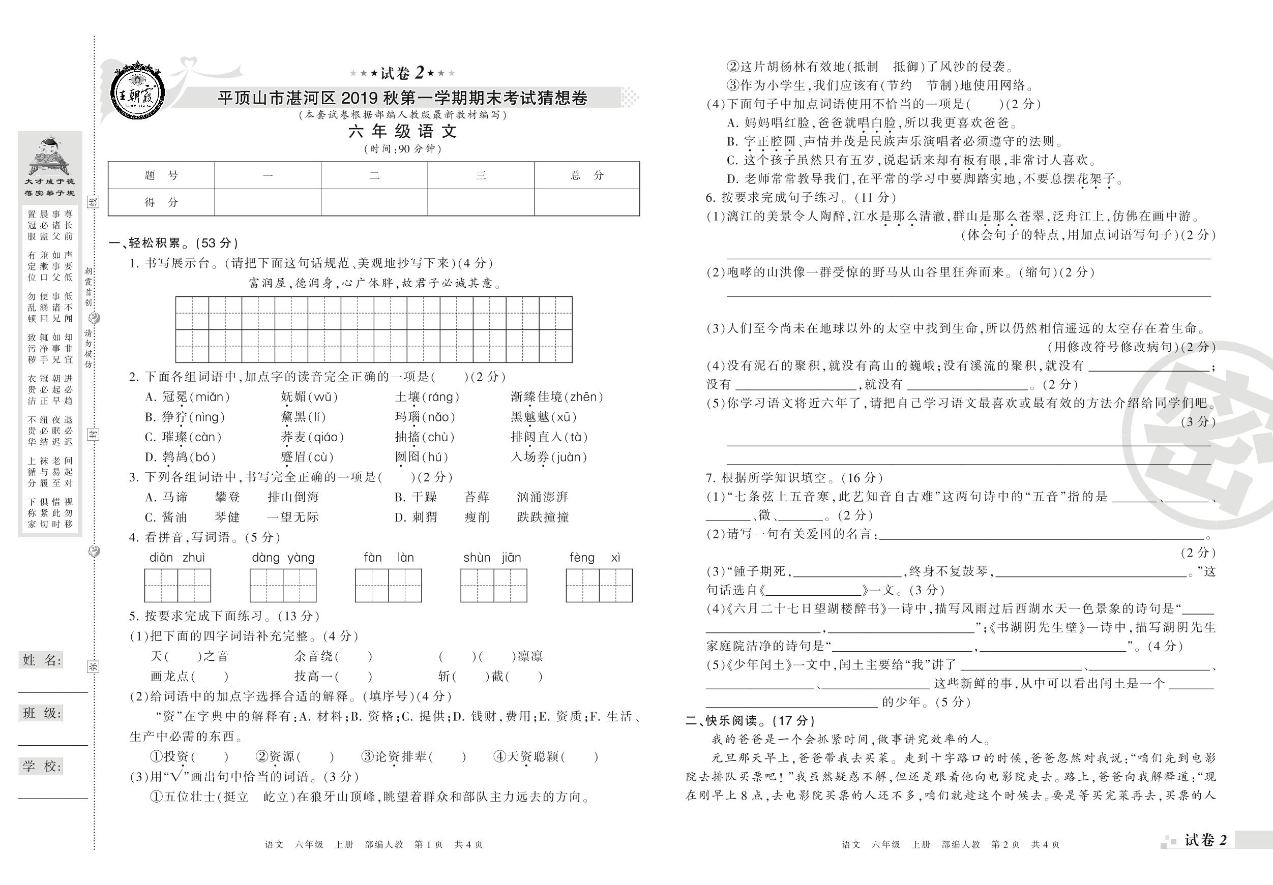 2019-2020学年第一学期平顶山市湛河区猜想卷六年级语文试卷(人教版)【2】
