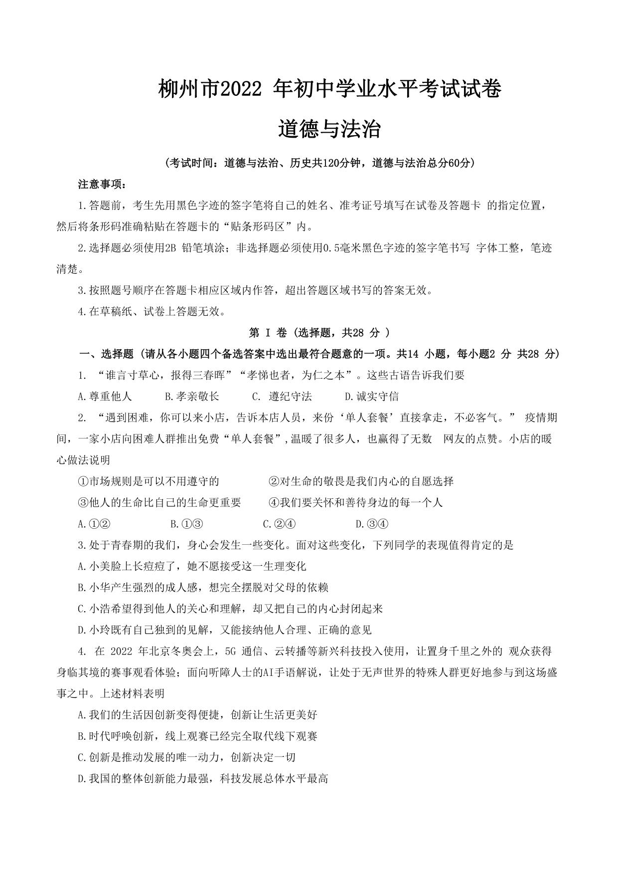 2022年广西柳州市中考道德与法治真题