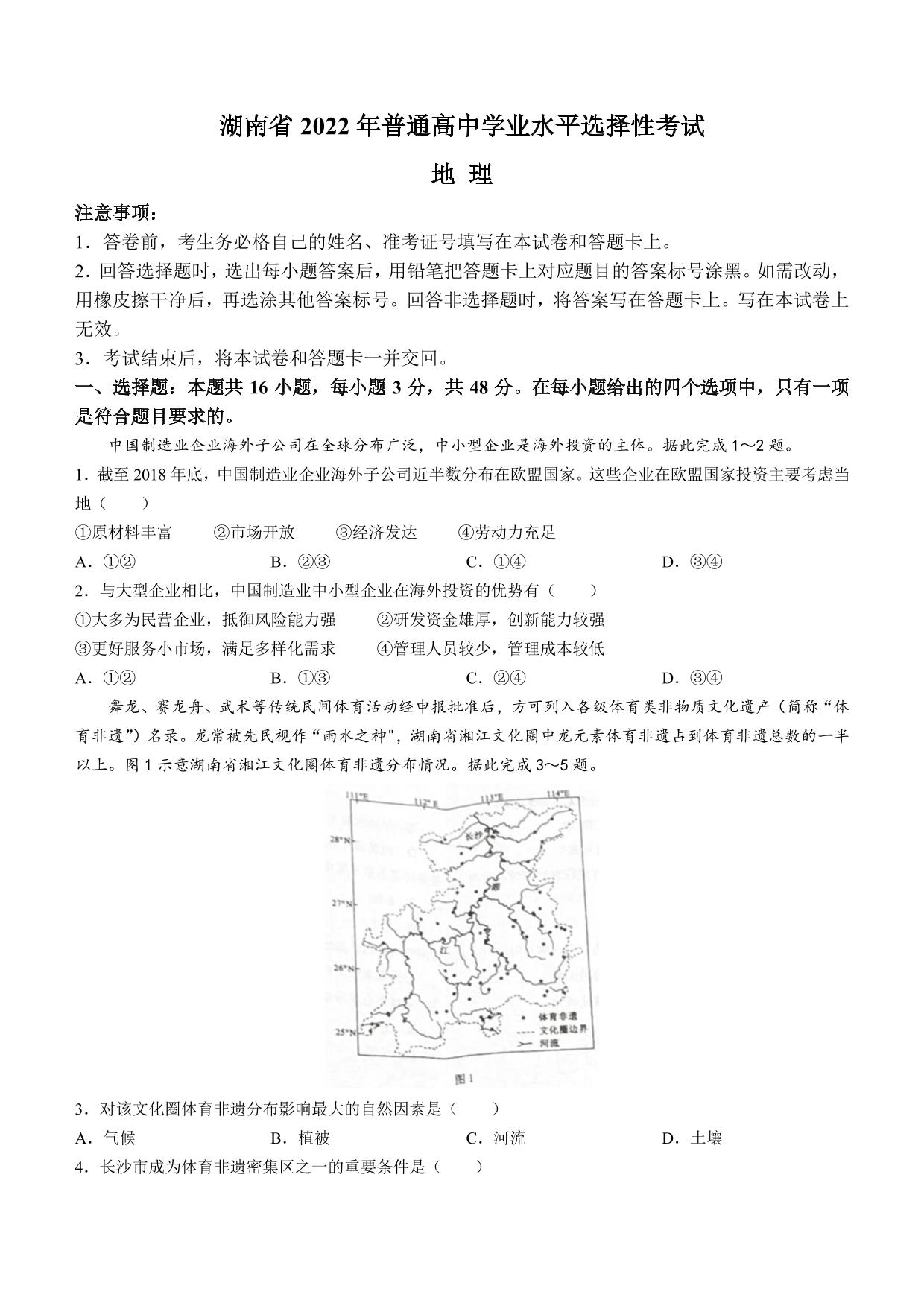 2022年高考湖南卷-地理
