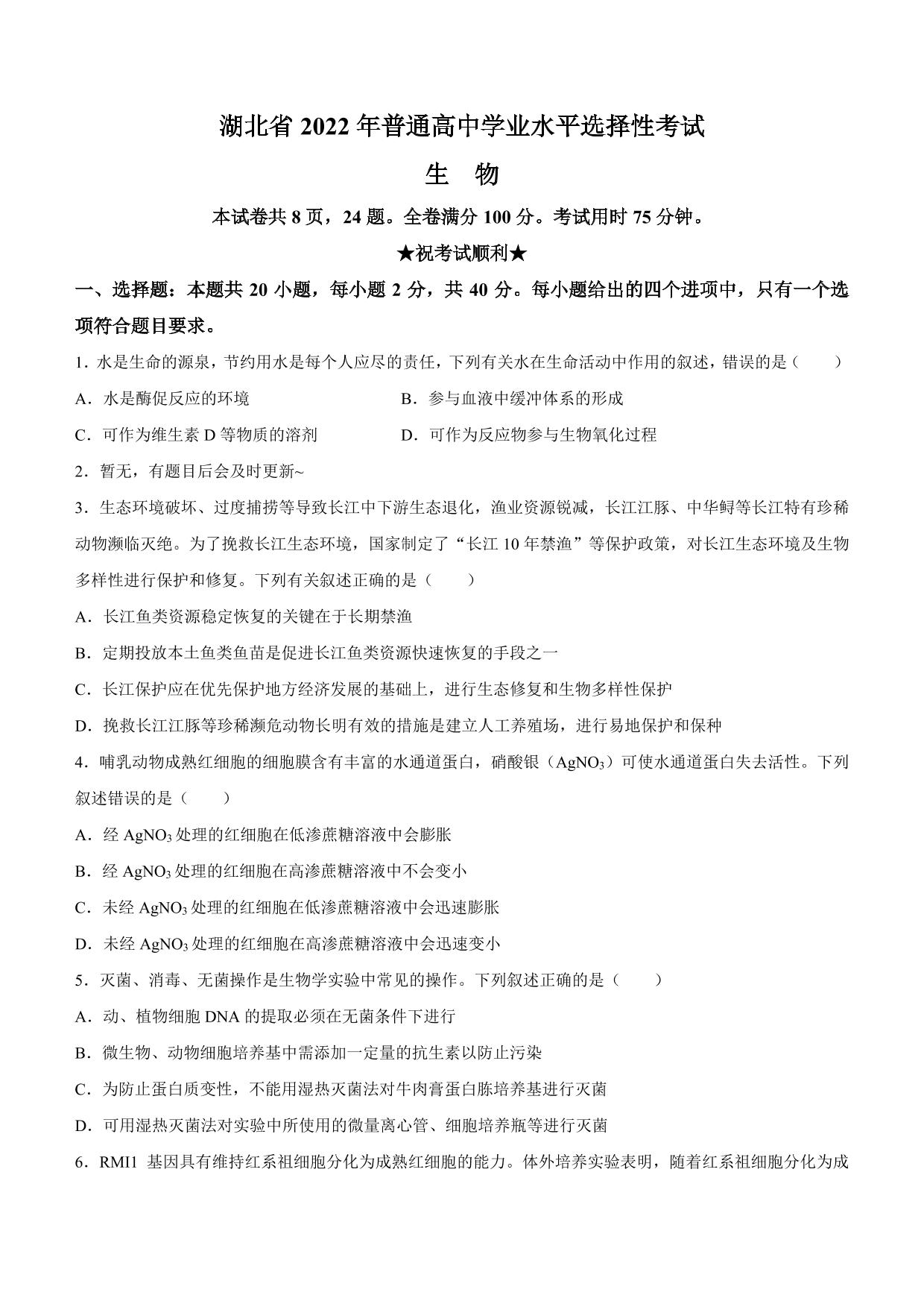 2022年高考湖北卷-生物