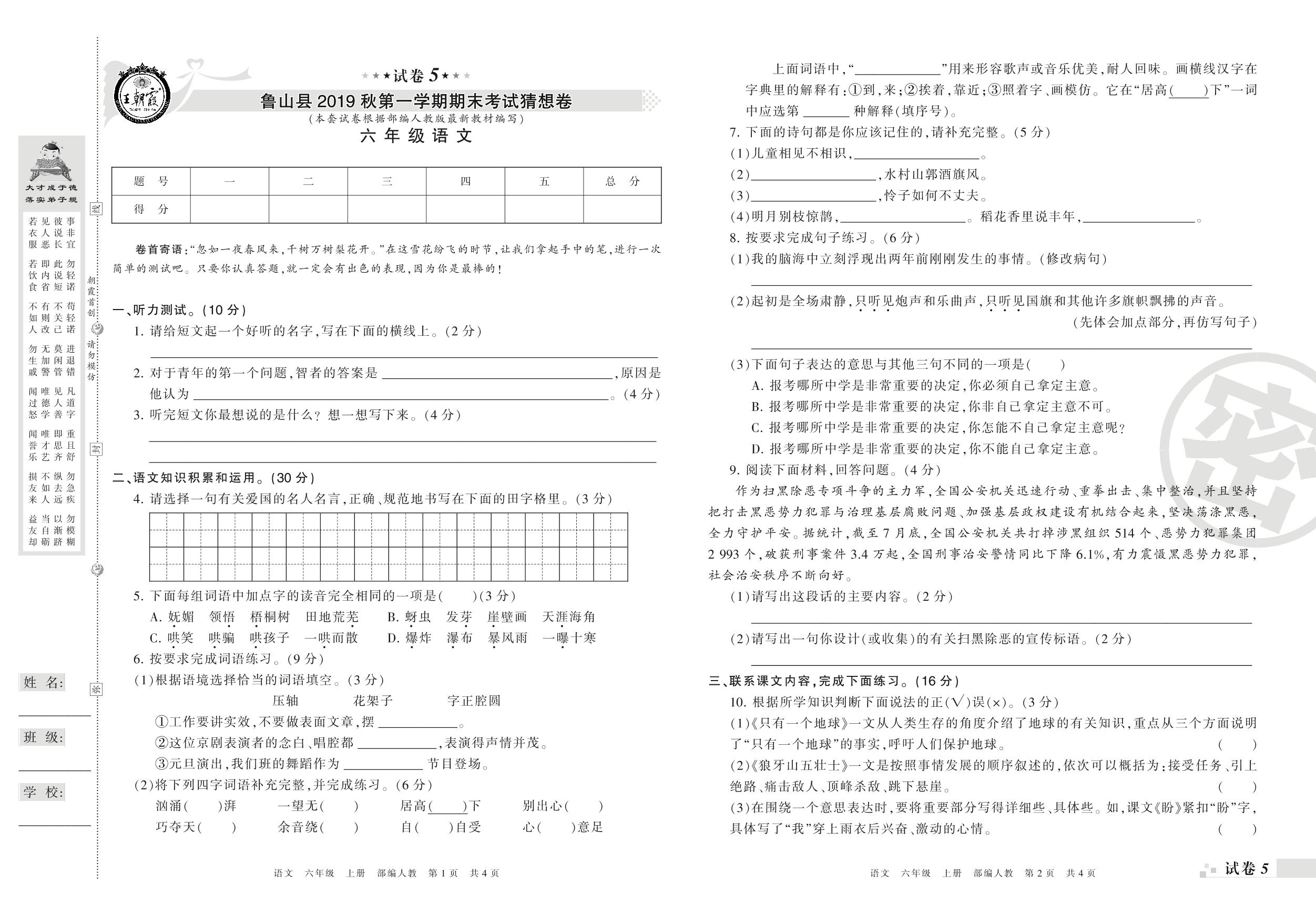 2019-2020学年第一学期平顶山市鲁山县猜想卷六年级语文试卷(人教版)【5】